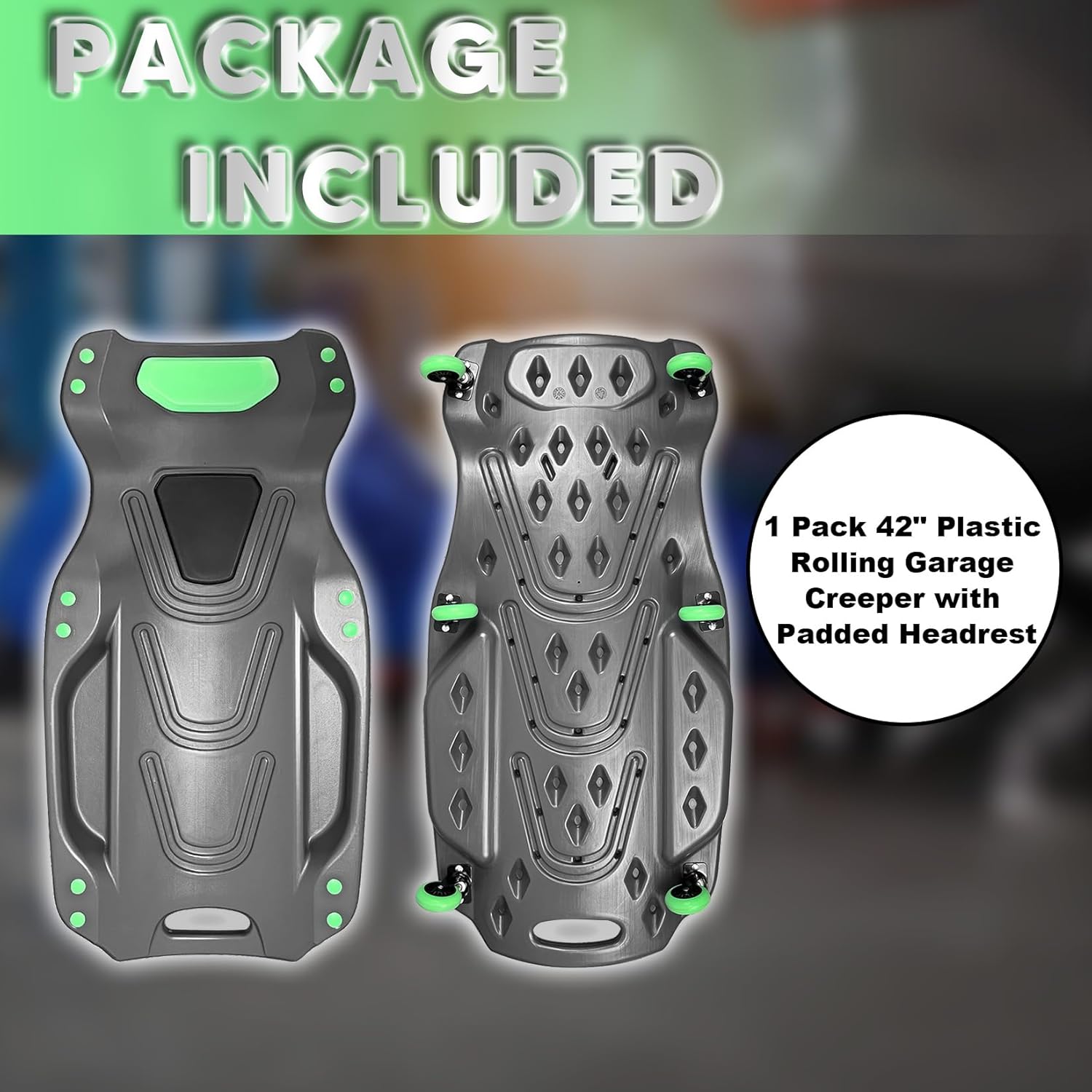 [Lightweight And Strong] The 42” Plastic Creeper is a one-piece blow-molded climber made of 100% HDPE plastic. The Mechanic Plastic Creeper weighs only 11.9 lbs (5.4 kg), but is strong and impact resistant.The EVA headrest pad is soft, shock and slip resistant, flexible, abrasion and corrosion resistant, and will withstand long periods of use and wear and tear without loss of quality or performance.