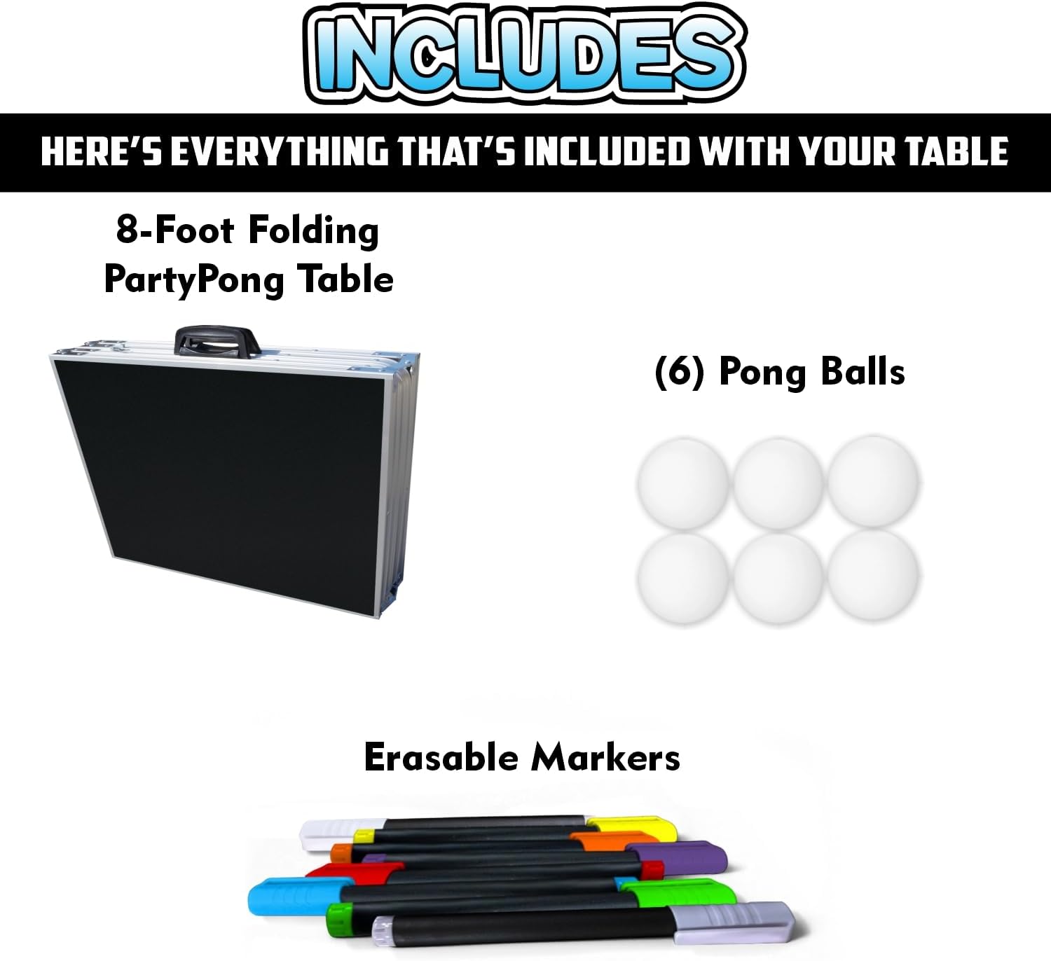 INCLUDES: PartyPong Table, Foam pong ball holder attached under the table w/ 6 high-quality PartyPong balls & Erasable Chalk Markers