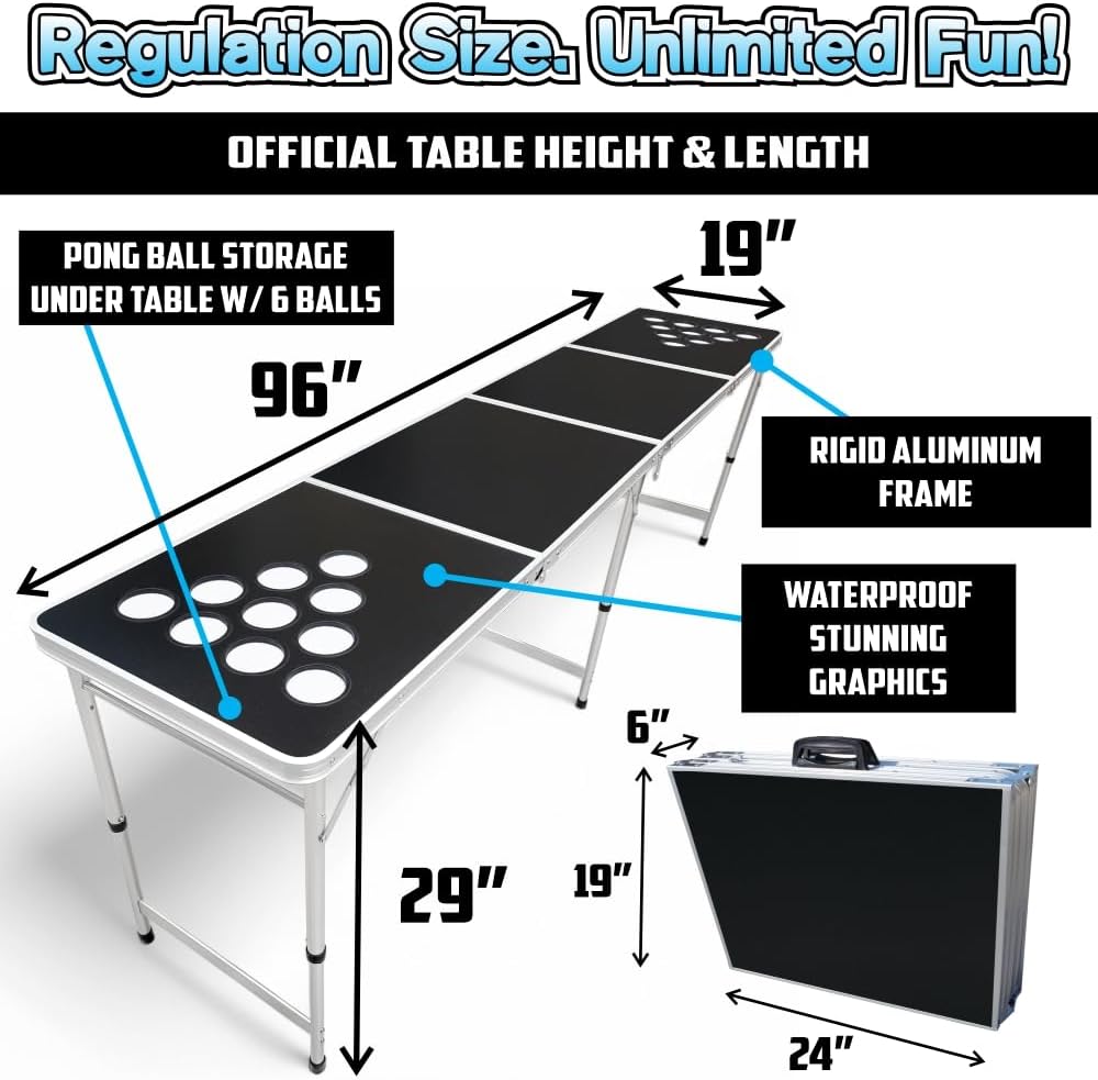 SIZE & SPECS: [OFFICIAL SIZE] 8 feet long & 29 inches tall. [PORTABLE] Folding into a 24 inch x 19 inch x 6 inch case, our lightweight (only 17 lbs.) and foldable design makes it easy to take to parties, tailgates, and more. [DURABLE]: Made of strong aluminum framing and liquid-resistant melamine surface panels. [AFFORDABLE] Enjoy the classic “water” pong experience without breaking the bank.