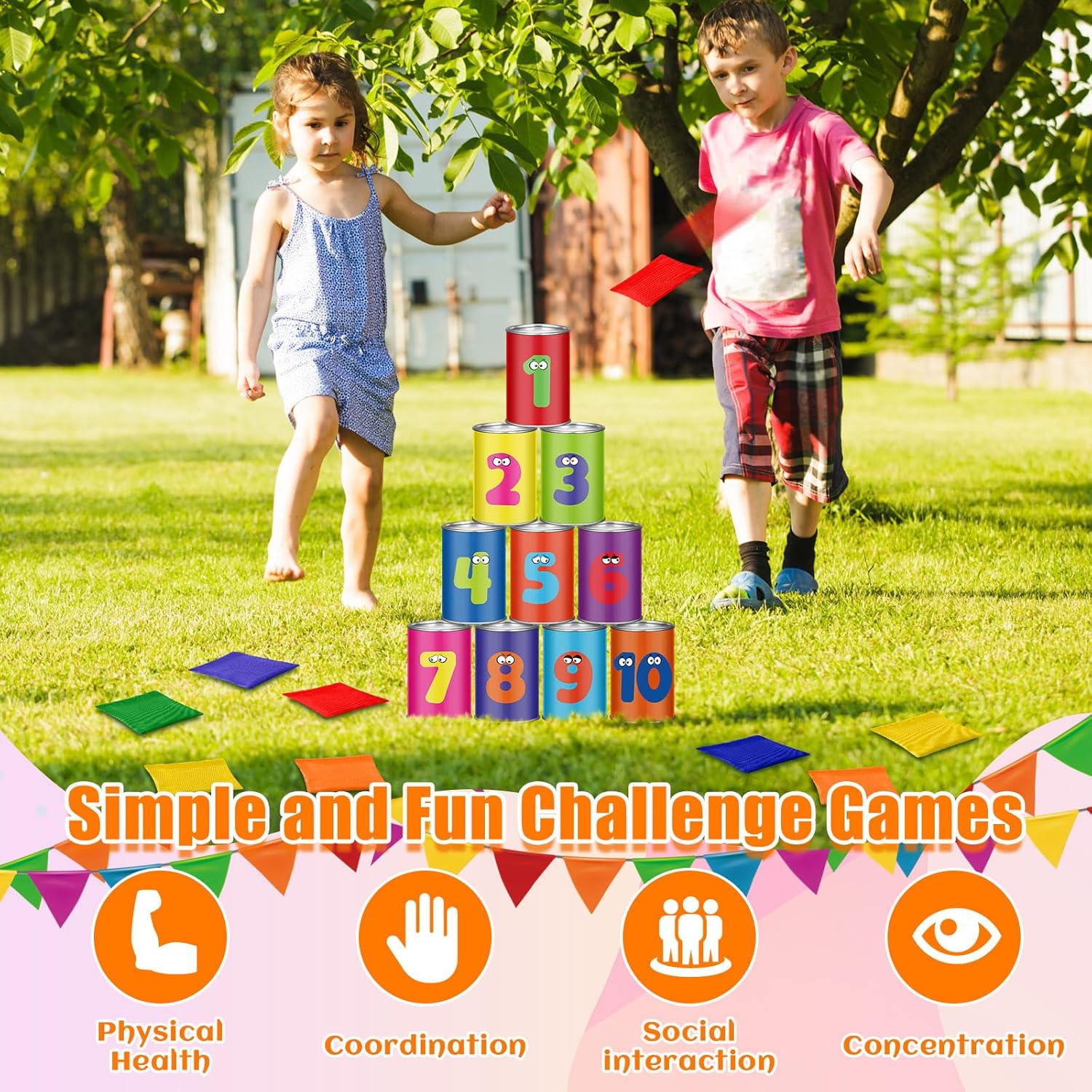 Packing List: carnival game set contains 10 fun tin cans and 12 beanbags; Colored cans have different design, and rating numbers on the back, which is fun carnival game set; Let your friends and family have fun games together