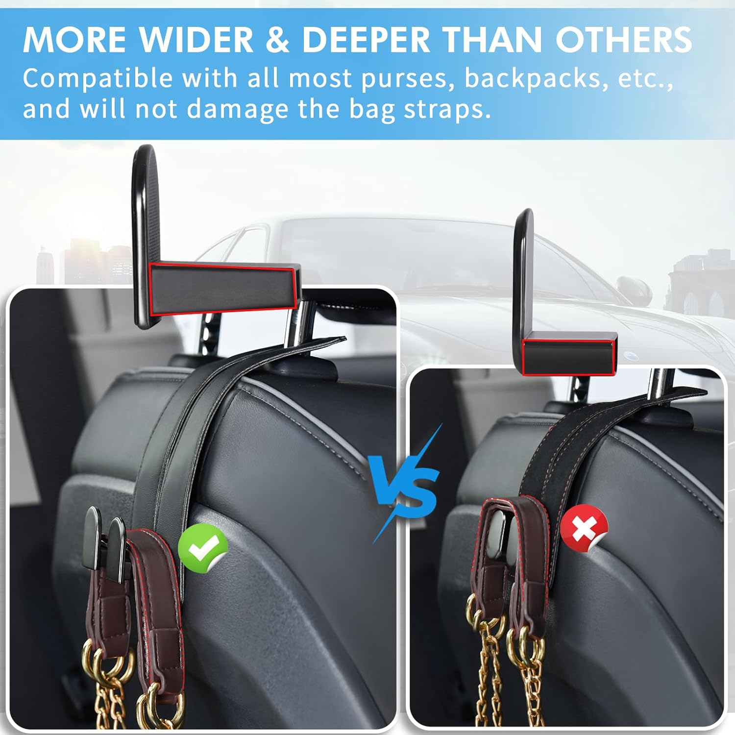 LYOOLY CAR SEAT BACK HOOKS, MORE WIDE & DEEP THAN OTHERS – It’s compatible with all most purse, backpack and so on. And it’s been a great addition to how we store things in our car. When we have passengers in the cars, these car hooks are not intrusive or in their way. When we need it, it’s so handy to just put your purse (or my fanny pack) on the hook and have it easily available as needed. Such a simple device, and it works great!
