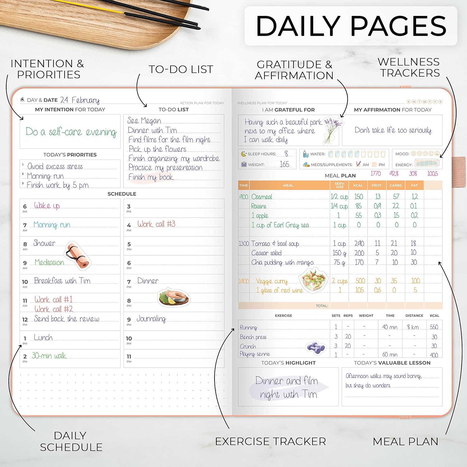 BUILD A SUSTAINABLE, HEALTHY LIFESTYLE ONE DAY AT A TIME: Use detailed daily, weekly, and monthly pages to practice gratitude and affirmations, manage your schedule, plan daily meals and to-do’s, set goals and priorities, and more.