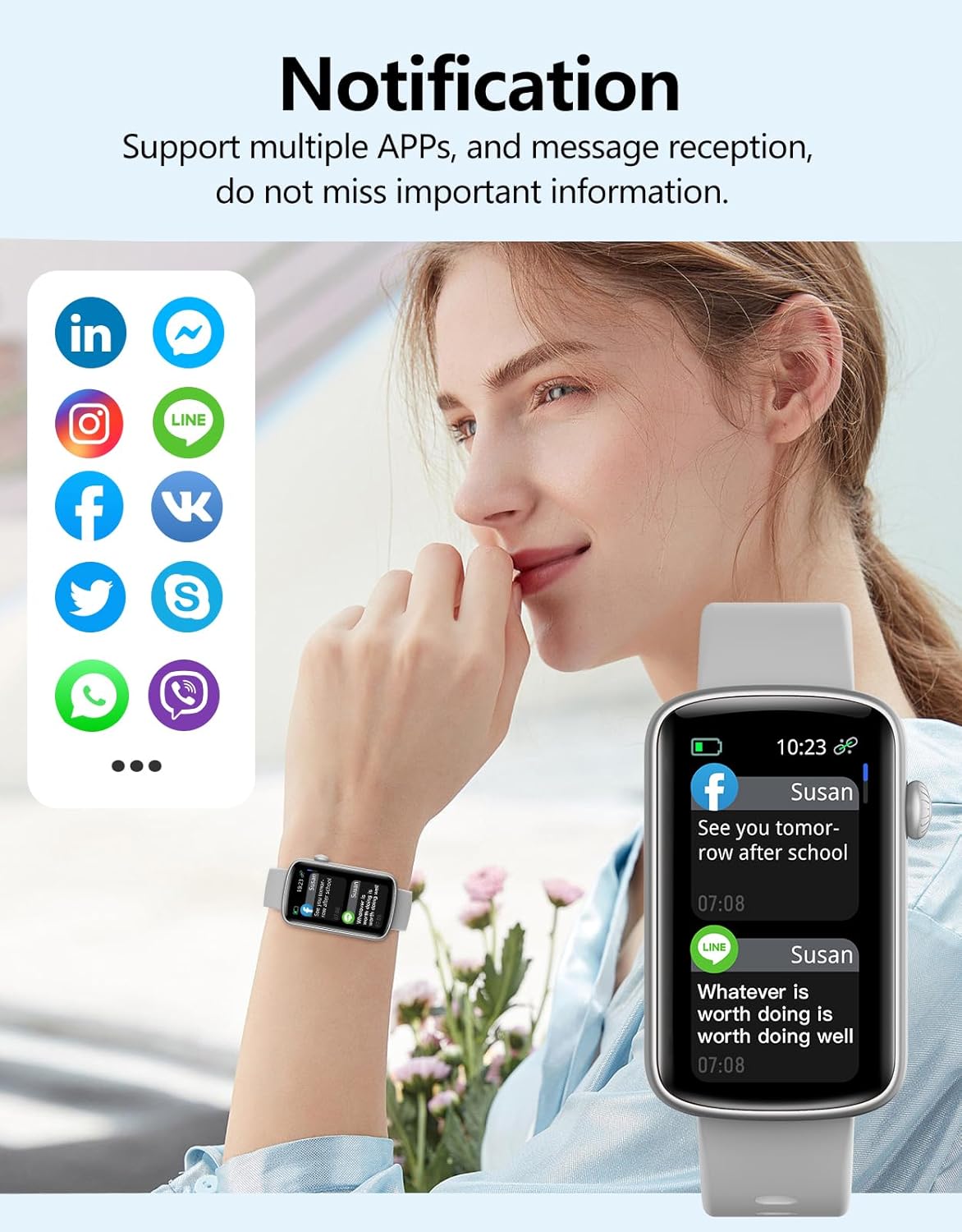Keeping up with important notifications is simple with this smartwatch, which can receive SMS and APP messages (Facebook, WhatsApp, Twitter, Instagram, and so on).