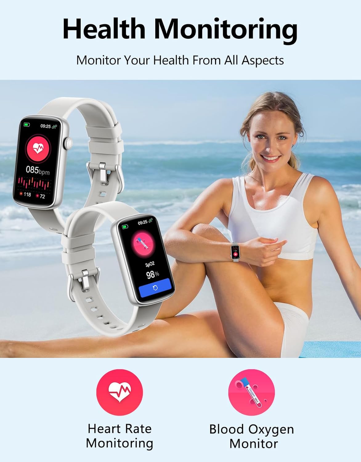 This health watch can monitor your heart rate and blood oxygen levels in real time, as well as record your steps and calories, and deliver extensive analysis directly to your smartphone.