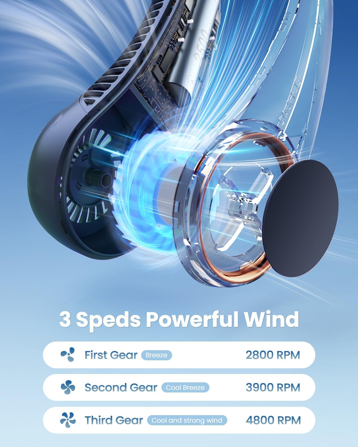 Powerful Wind with 3 Speed Settings: This neck cooler uses turbine blades to boost airflow, delivering steady, strong wind that quickly refreshes you. You can easily adjust the speed to suit your needs—whether you want a gentle breeze or a powerful blast