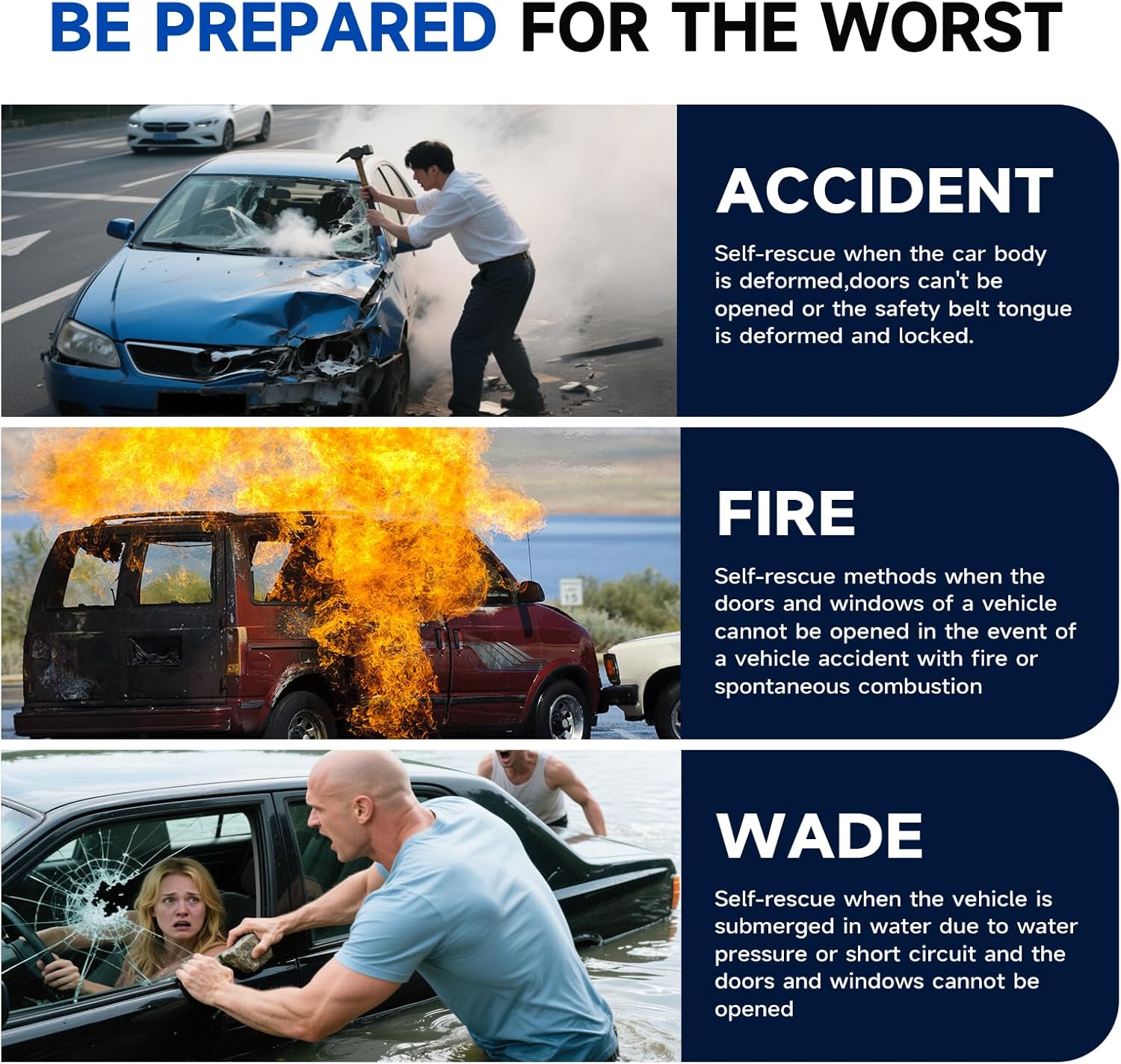 Seatbelt Cutter: The built-in razor-sharp cutter mimics the natural motion of slicing a seatbelt under tension. Even with shaky hands, a single pull cleanly severs jammed straps