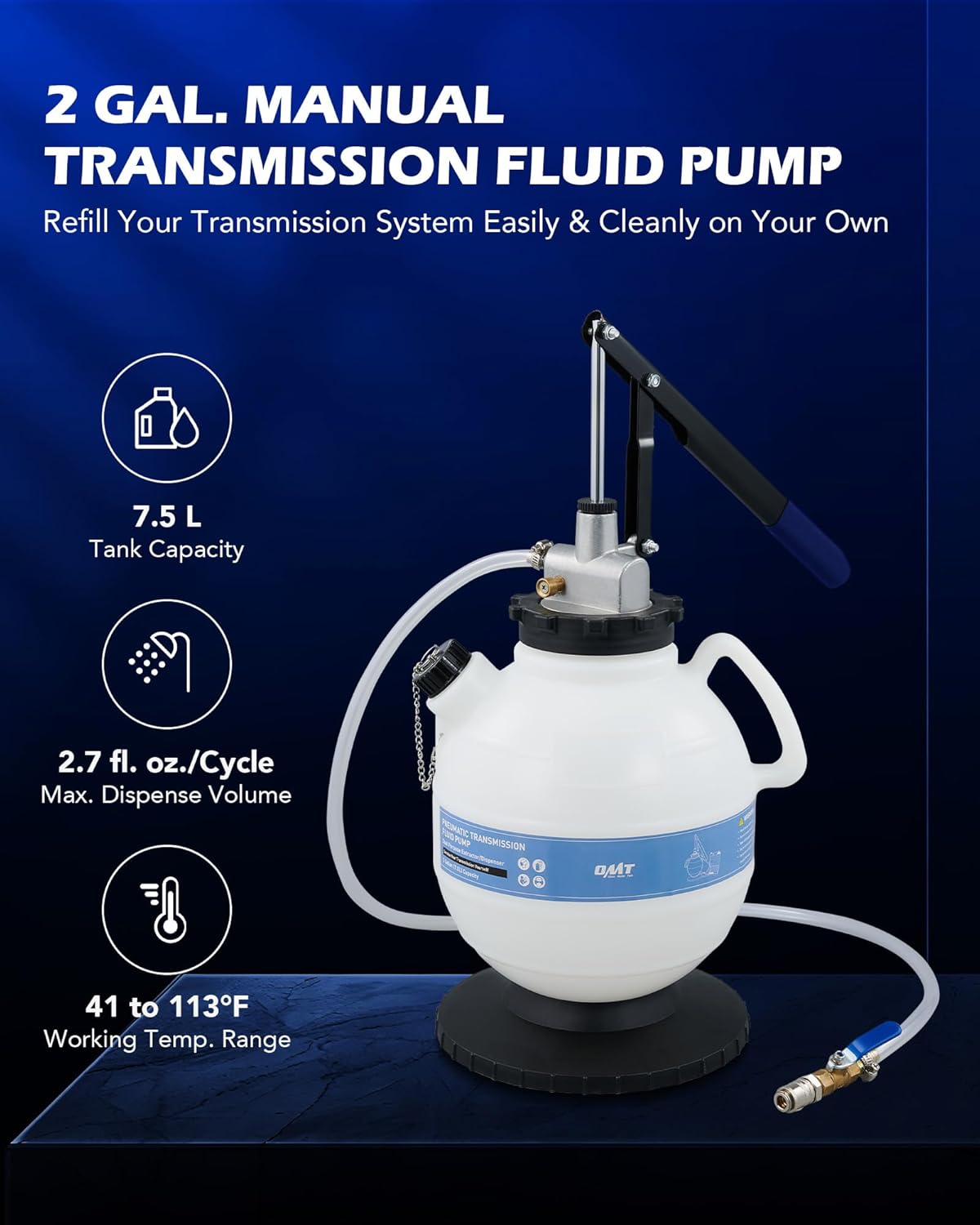 7.5L FLUID DISPENSER: This 2 gallon manual ATF refill kit by Orion Motor Tech features an extra long lever that dispenses up to 2.7 fluid ounces of transmission fluid