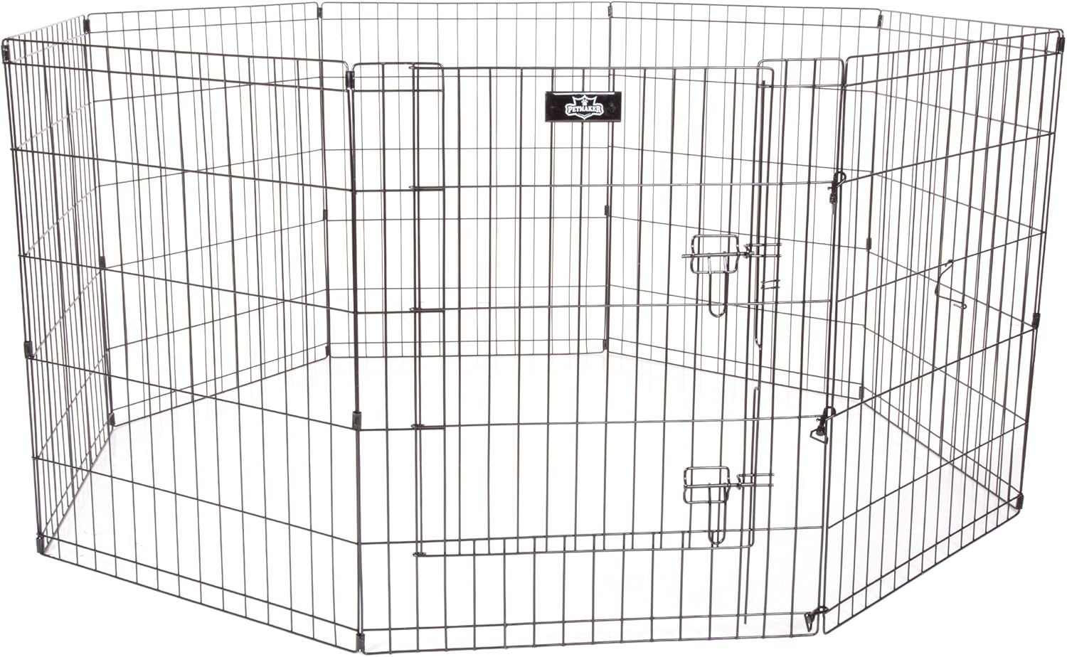 The Exercise Playpen by Petmaker provides a great enclosure to keep your pet safe and secure indoors or out. The Petmaker Exercise Playpen is constructed of 8 durable coated steel 24″ x 30″ panels and features a black epoxy coated finish for long lasting protection against the elements. Each exercise pen is simple to set up (no tools required) and includes 8 ground stakes for secure set-up while being used outdoors and 4 thumb-snaps for easy assembly. These versatile pens can be used for a variety of pets and fold flat for convenient storage when not in use.