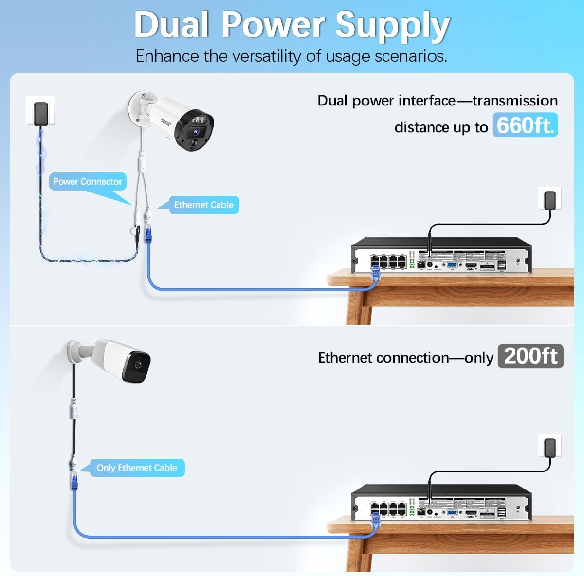 【Dual Power Supply Mode】 The WEILAILIFE wired security camera system features dual power options, including Ethernet and power connectors for enhanced flexibility. While the standard PoE Ethernet cable transmission distance is 60 meters, using the power connector allows for a local power supply near the camera, extending the range of the video security system to over 200 meters (about 660 feet). This setup improves the stability and coverage of the outdoor security camera system, increasing the transmission distance by more than three times compared to using Ethernet alone.