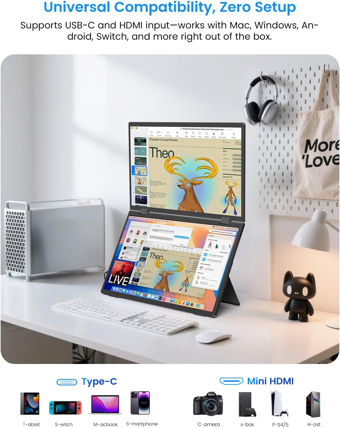 Wide Compatibility, Plug & Play: Equipped with dual full-featured USB-C ports and a Mini HDMI—works instantly with laptops, phones, tablets, gaming consoles, and more.