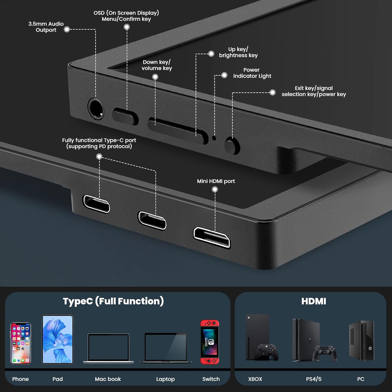 [Wide Compatibility] – The travel monitor supports USB-C and HDMI connectivity, enabling duplicate display or extended display functionality for your devices. It compatible with various devices, including laptops, PCs, tablets, gaming consoles (Switch/PS5/Xbox), and even phones (with DP-enabled USB-C). Note: When connecting via a single USB-C cable, ensure the host device’s USB-C port supports DisplayPort Alternate Mode and Power Delivery functionality.