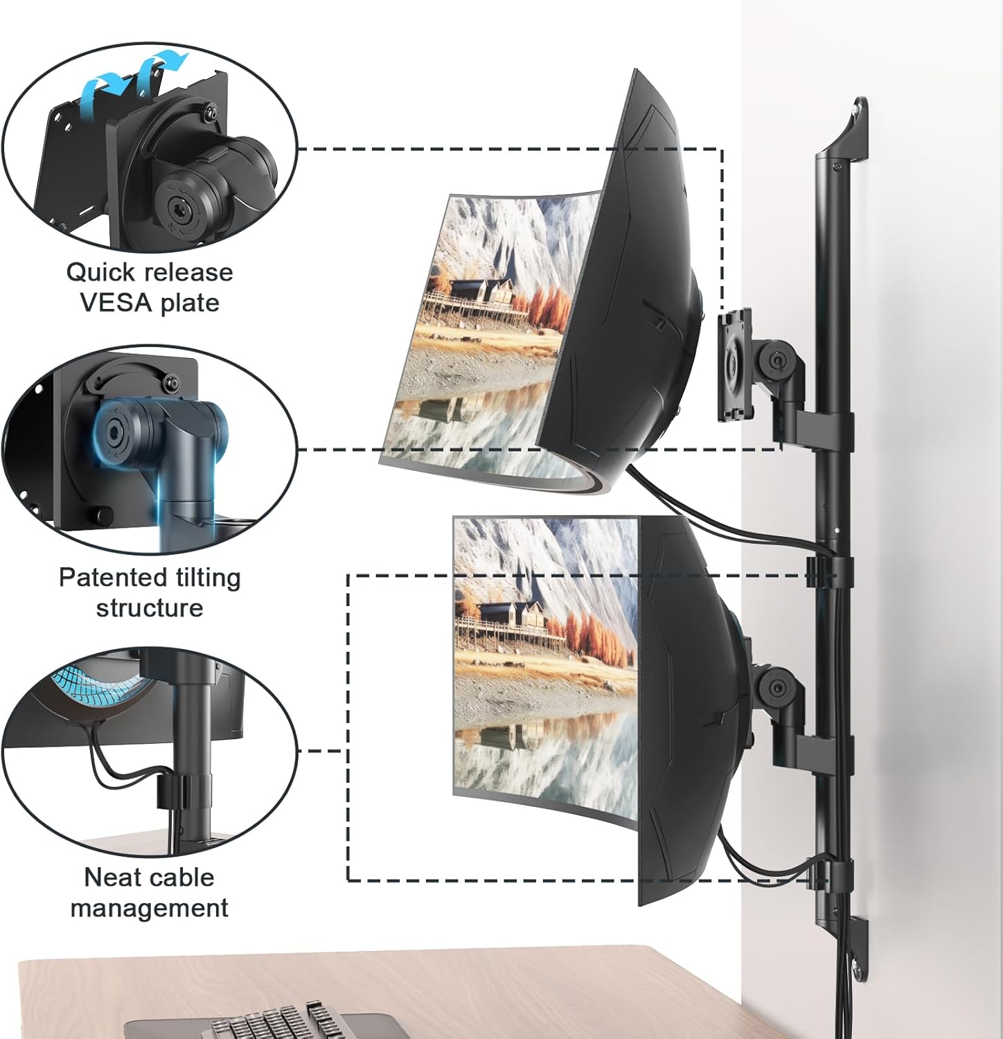 Optimize Your Workspace: With 4.3 inches of wall clearance, keeps your monitor at a healthy viewing distance; built-in cable management keeps wires tidy and out of sight, while wall mounting free up much valuable space on your desk, reduces neck strain by letting you position screens at eye level.