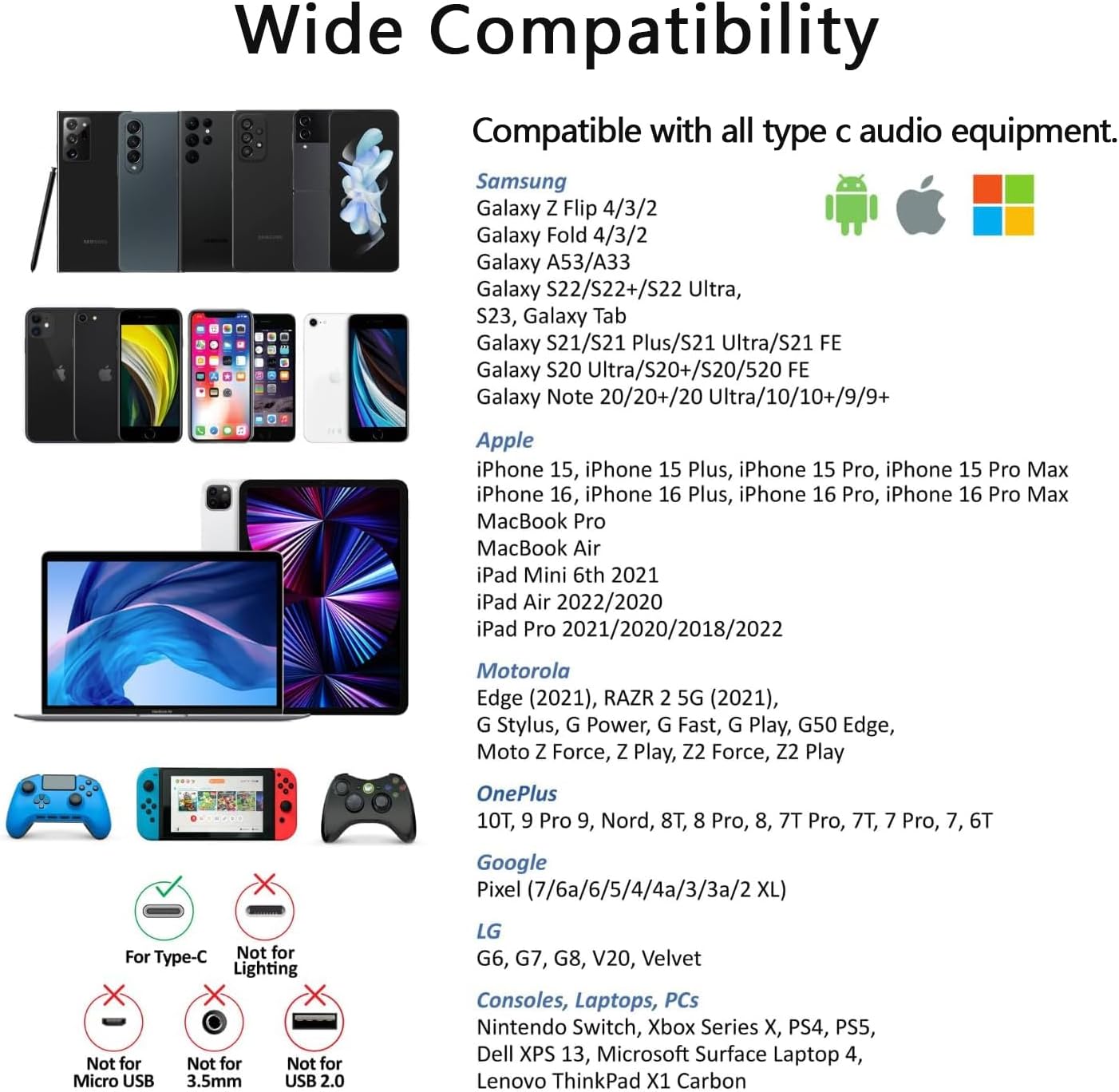 [Compatibility List] – The USB C earphones compatible with iPhone 15 16/plus/pro/pro max, Google Pixel 8/7/6/5/4/3/3XL/2/2XL, Samsung Galaxy S25 S24 S23 S22 S21 S20 Ultra FE A53 A54, Galaxy Note 20/10 Ultra, iPad pro 2022/2021/2020/2018, One Plus, HUAWEI, LG.(If you are not sure, please feel free to consult us).