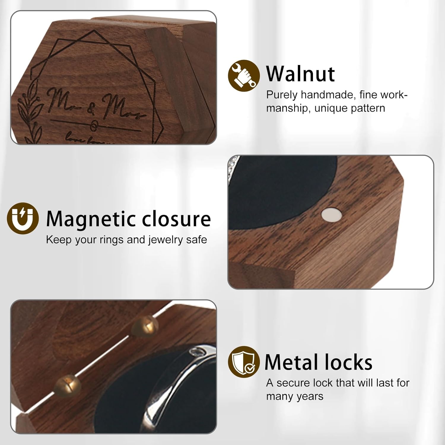 2 Slots Wooden Engagement Ring Box Premium Black Walnut Magnetic Closure Jewelry Gift Box for Engagement, Wedding, Proposal
