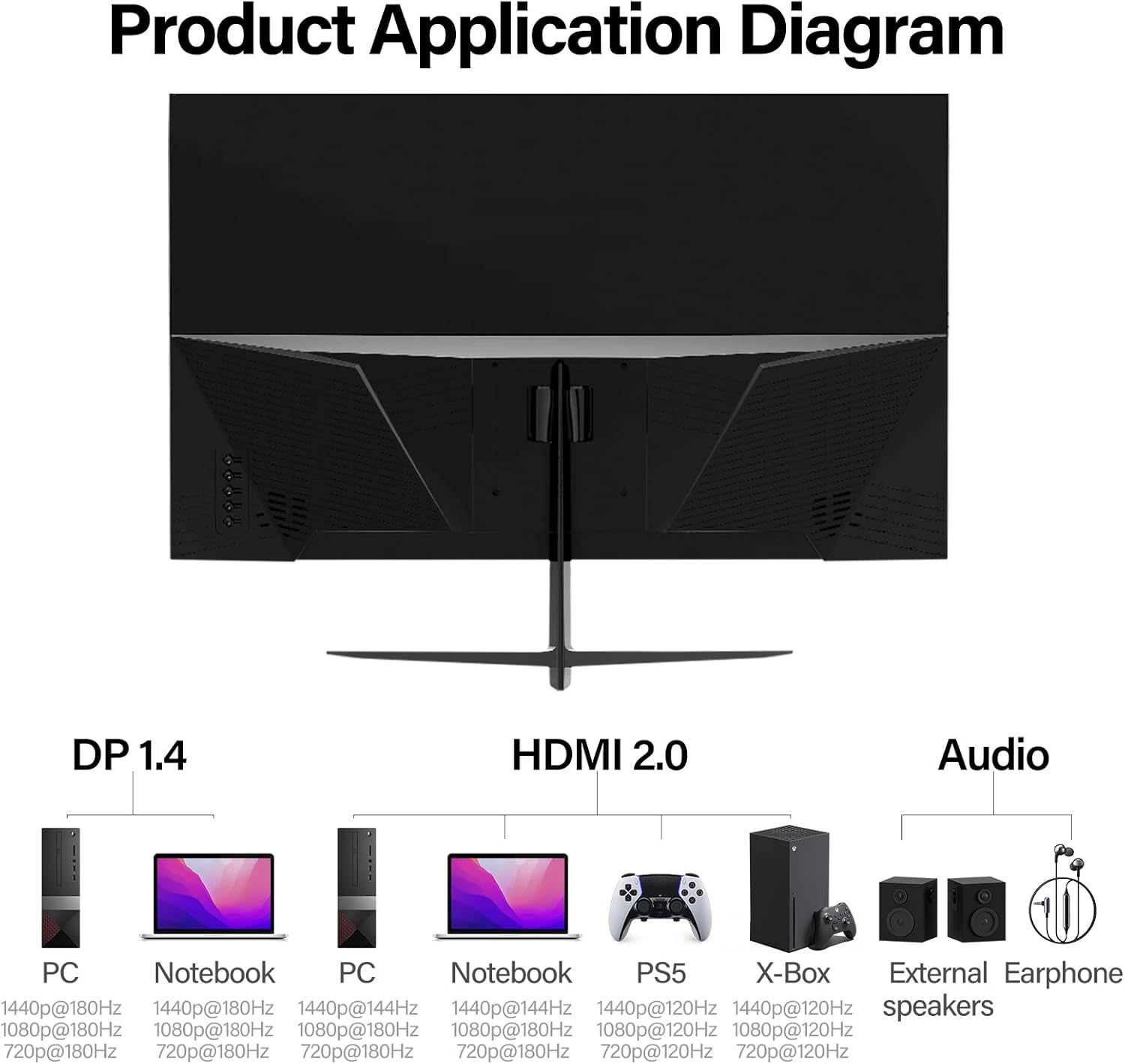 Multi-Device Connectivity: DisplayPort 1.4 (supports 180Hz) + HDMI 2.0 (144Hz for consoles like PS5/Xbox) Ergonomic stand: -5° to 10° tilt adjustment and 100x100mm VESA mount compatibility Work-friendly modes: Low Blue Light and E-Reading presets for task switching