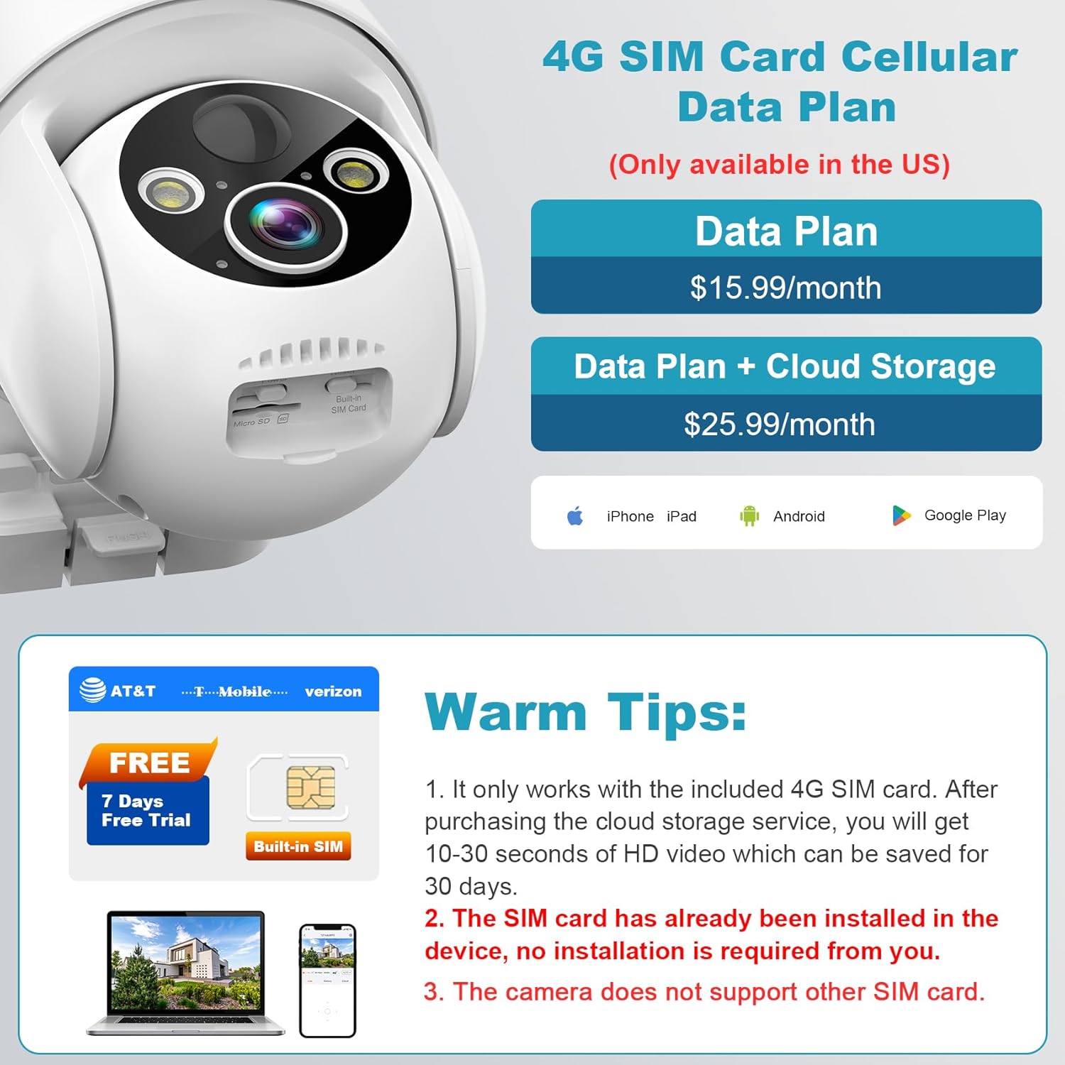 SIM Card Included & Subscription Plan: the built-in SIM card supports 4G LTE networks from Verizon, T-Mobile and AT&T, the trial data activates when the camera connects to 4G network and lasts 7 days. After that, you need to renew the data plan at $15.99/ $25.99 monthly in the app, otherwise the camera will stop running. This 4G Security Outdoor Camera supports cloud & SD card storage (up to 128GB, not included) for you to save recordings.(Note: the camera doesn’t support other SIM card)