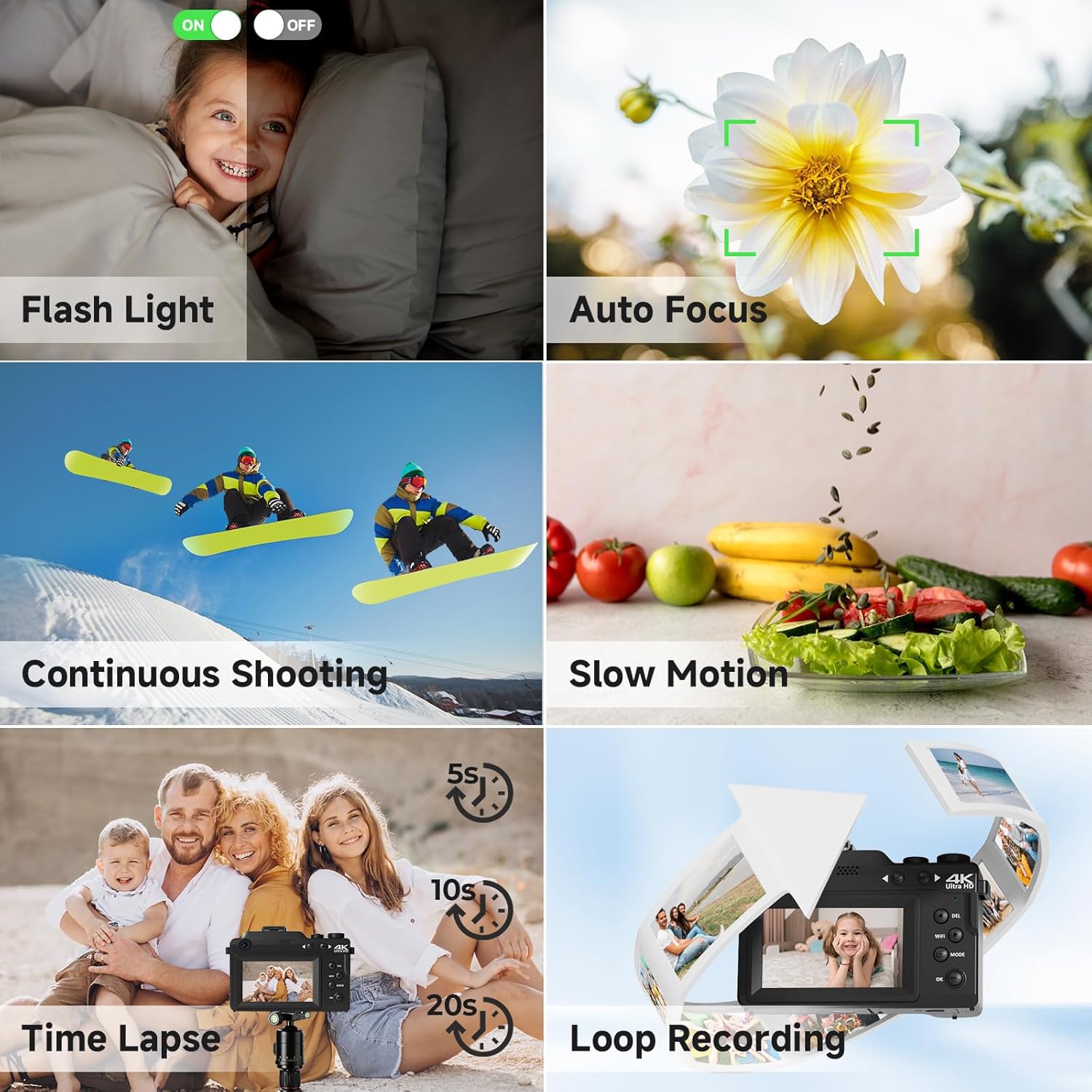 【Multifunctional WiFi Digital Camera】Long-pressing the “MODE” button on this point and shoot digital camera enables easy switching between various shooting modes: Photo, Auto Photo, Continuous Shooting, Time-Photo; Video Recording, Slow Motion, Loop Recording, Time-Lapse Recording. Also supports flash, timestamp, pause, white balance, playback, 8+ filters…easily create the atmosphere you want! This dslr camcorder includes WiFi for easy photo sharing and editing on smart devices. Connect your phone to the camera’s WiFi and bluetooth to share travel memories with friends and family or showcase your photography on social media