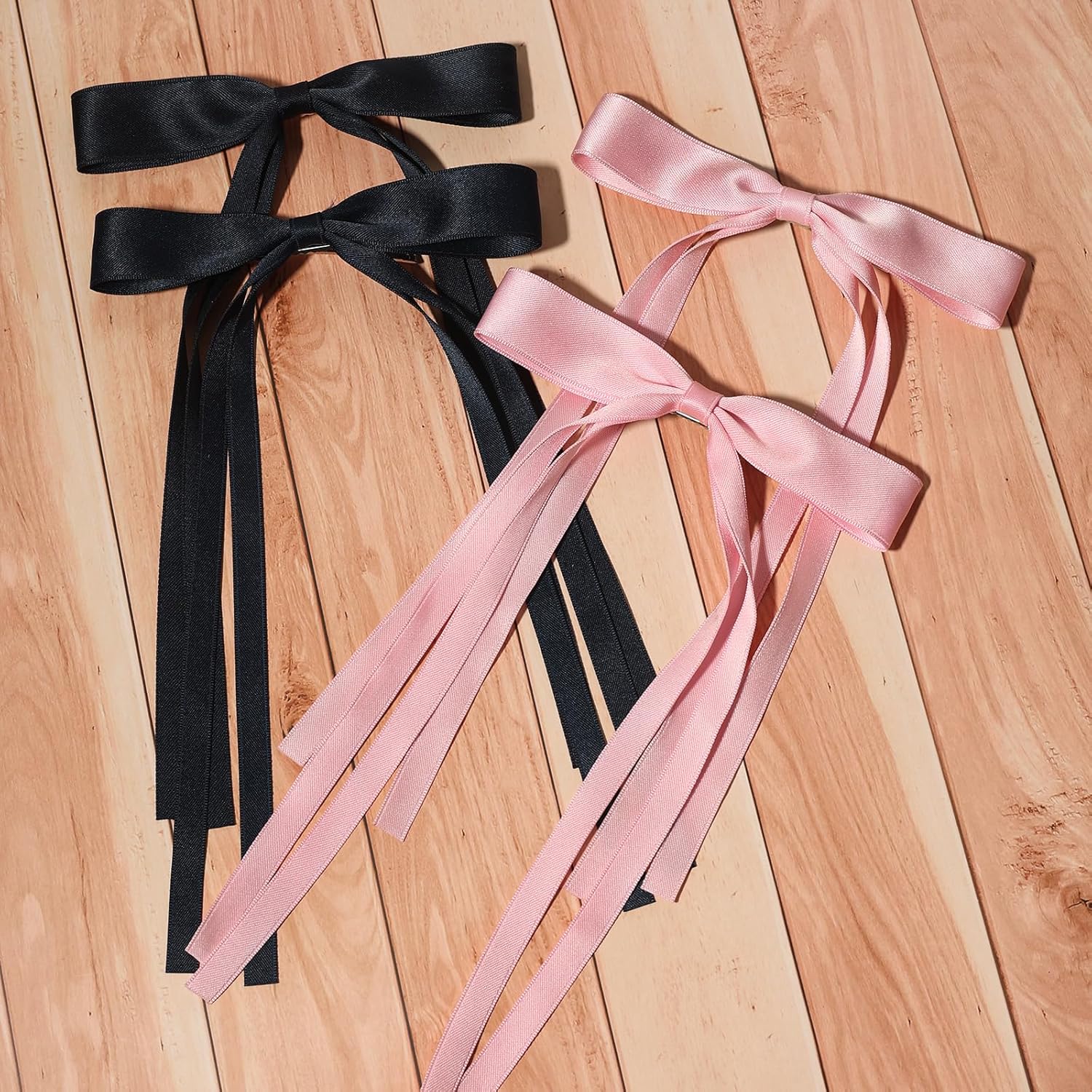 4pcs Tassel Ribbon Bowknot Hair Accessories with Long Tails, Solid Barrettes Claw Clips with Bows for Girls and Women (Navy Pink)