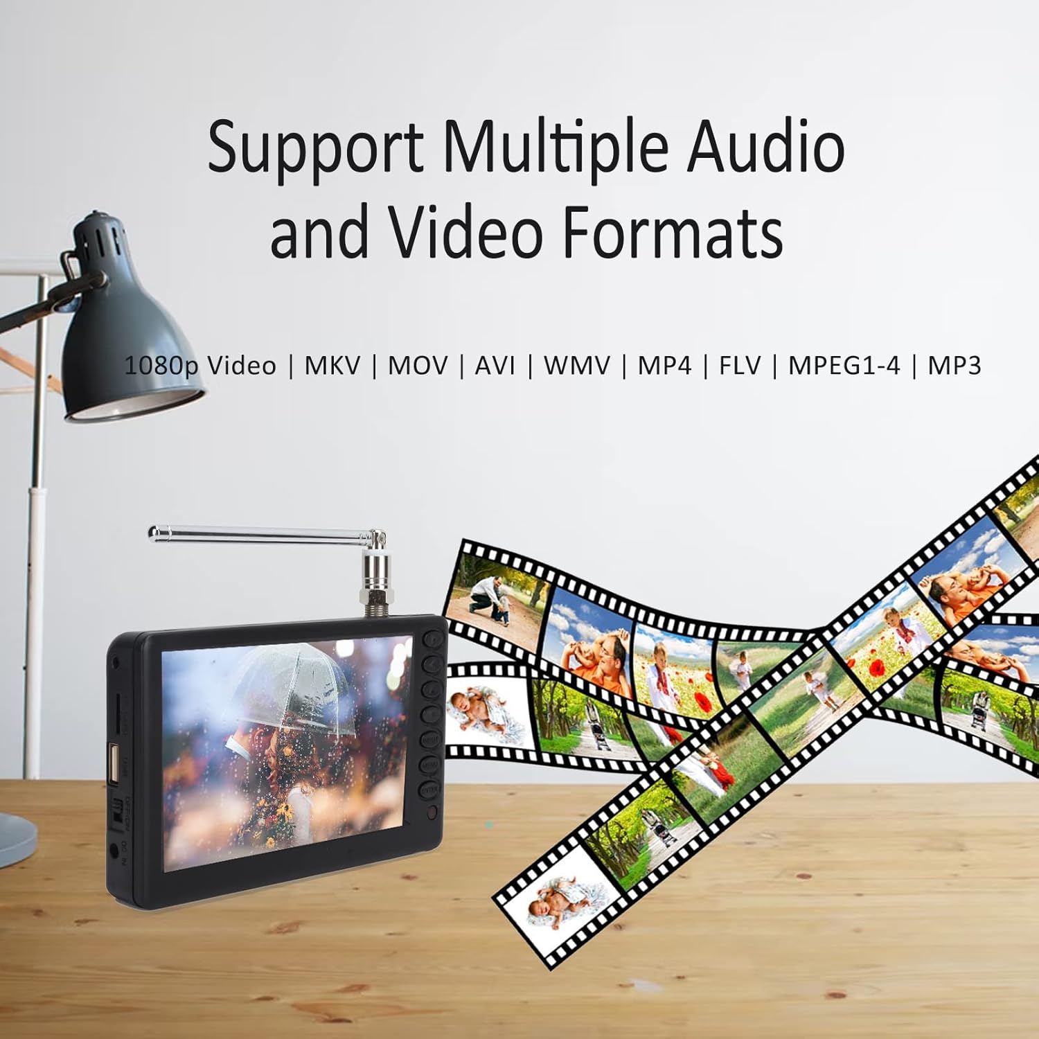 ABUNDANT INTERFACES: The Mini Digital Television has a USB port, Memory Card slot, can play U disk content, supports 1080p video, MKV, MOV, AVI, WMV, MP4, FLV, MPEG1‑4, MP3 and other functions.