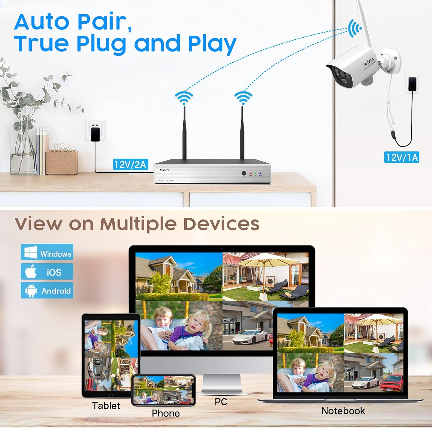 【Plug & Play and Easy Setup】The wireless cameras are paired with the NVR system at manufacturing site. Just power on and serve yourself with 24/7 surveillance. Perfect for villa, home, office, shop, warehouse, school, business or elsewhere you wish. (Refer to the manual for further usage)