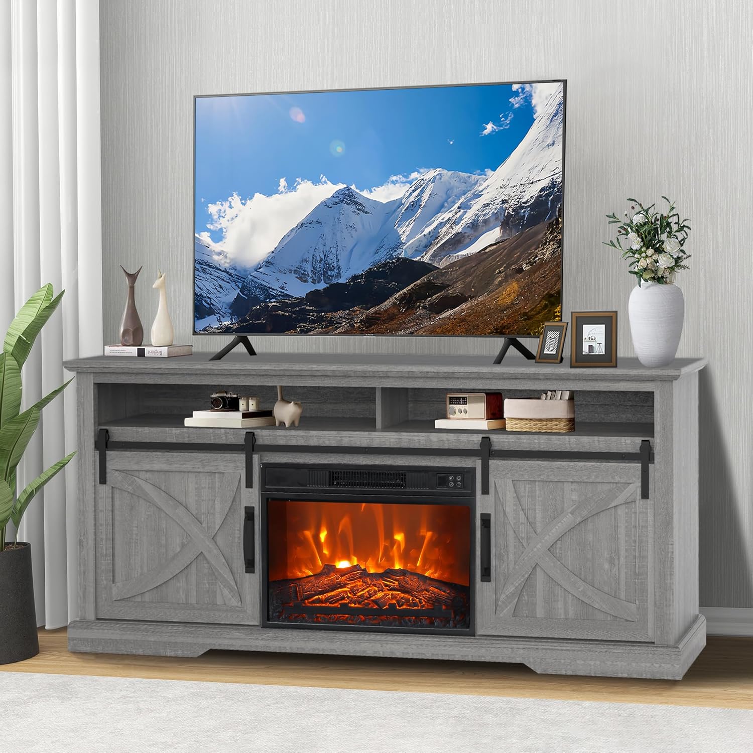 Be the first to review “68″ Fireplace TV Stand for 75″ Tvs with 23″ Electric Fireplace,Farmhouse Entertainment Center with Storage, Rustic TV Console with Sliding Bar Door for Living Room, Bedroom (Gray)”