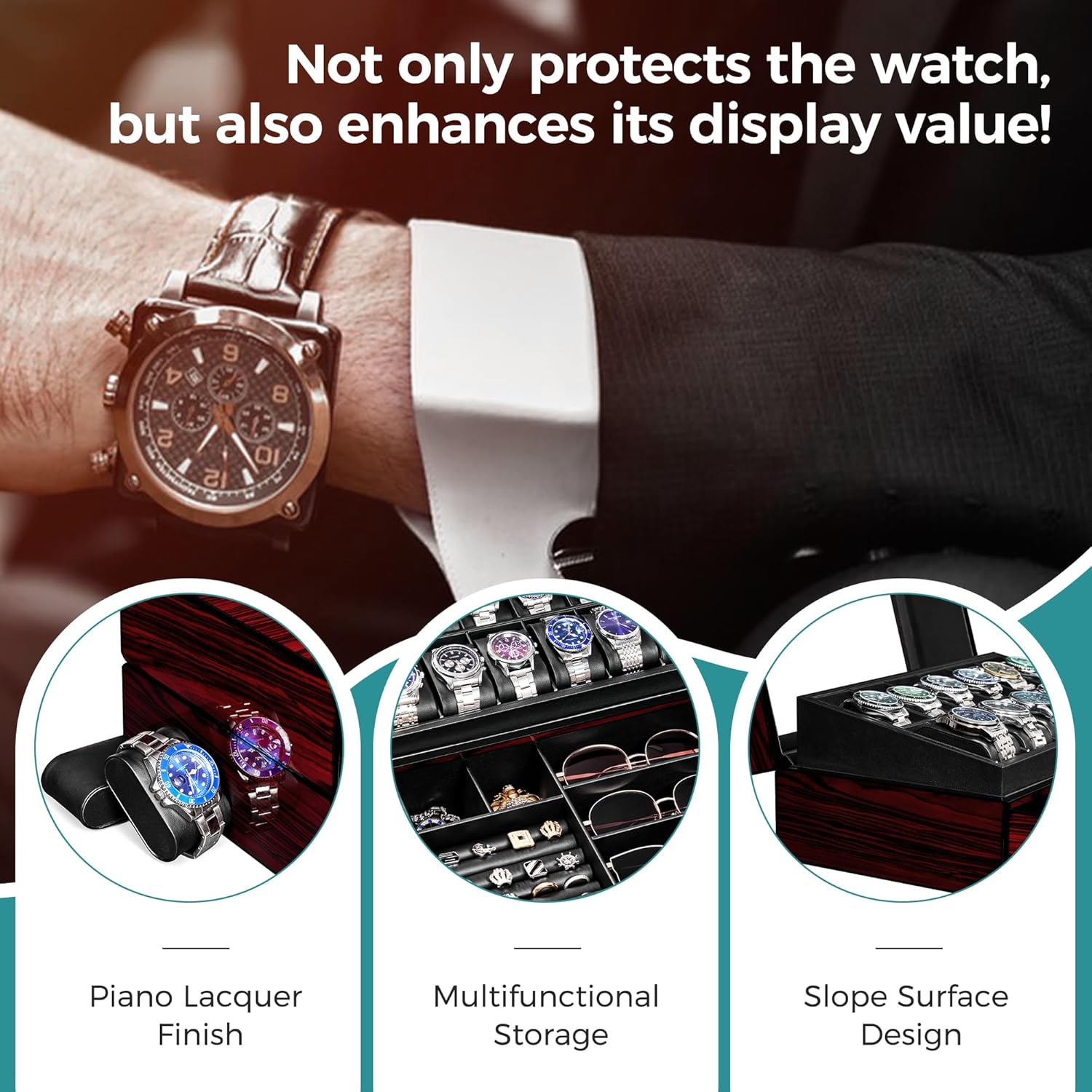 [360 DEGREES WITHOUT HIDING]: The watch box adopts a simple modern design, Large Clear Glass Lid 360-degree all-round display effect, but it can also effectively prevent dust and water, and is durable,the corners are rounded, the touch is delicate, showing a sense of refinement