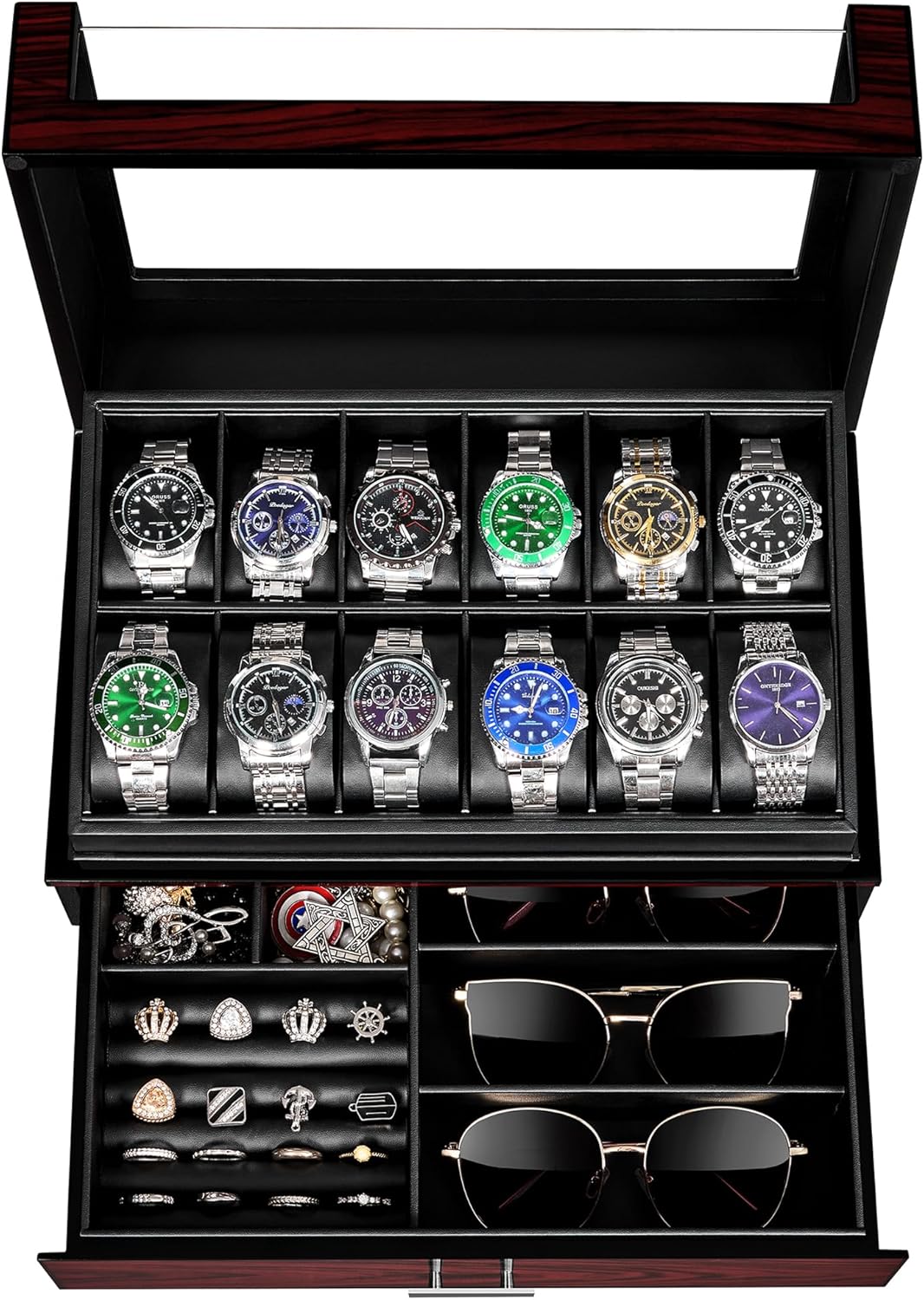 [2 Layers COMPARTMENTS]: This watch storage box has 2 layers 12 watch slots, bottom drawer with various areas,Removable partitions,For your watch face size up to 48 mm,You can also make room for other valuable jewelry and collectibles such as cufflinks, earrings, glasses, tie clips, etc