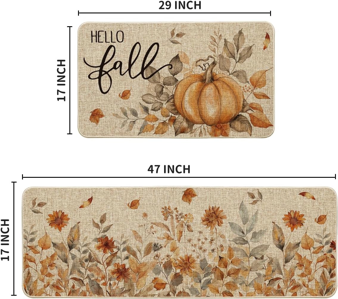 Artoid Mode Pumpkin Sunflowers Hello Fall Kitchen Mats Set of 2, Autumn Home Decor Low-Profile Kitchen Rugs for Floor – 17×29 and 17×47 Inch