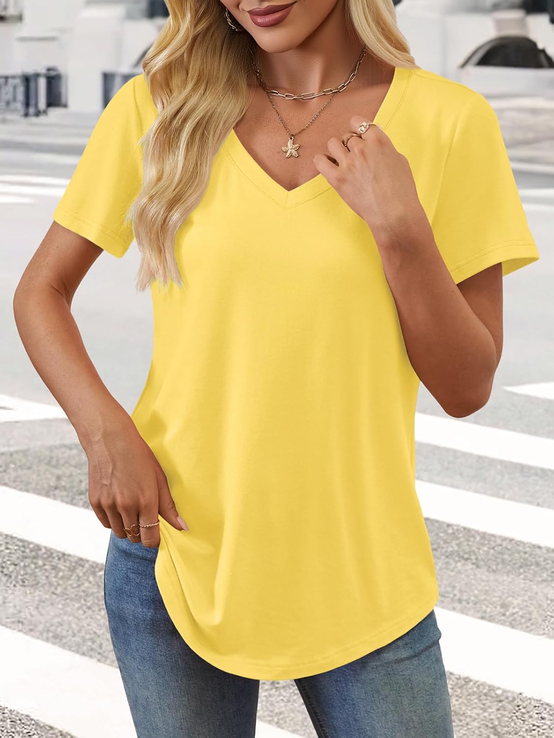 ATHMILE Womens V Neck Short Sleeve Summer T Shirts Curved Hem Plain Top Beach