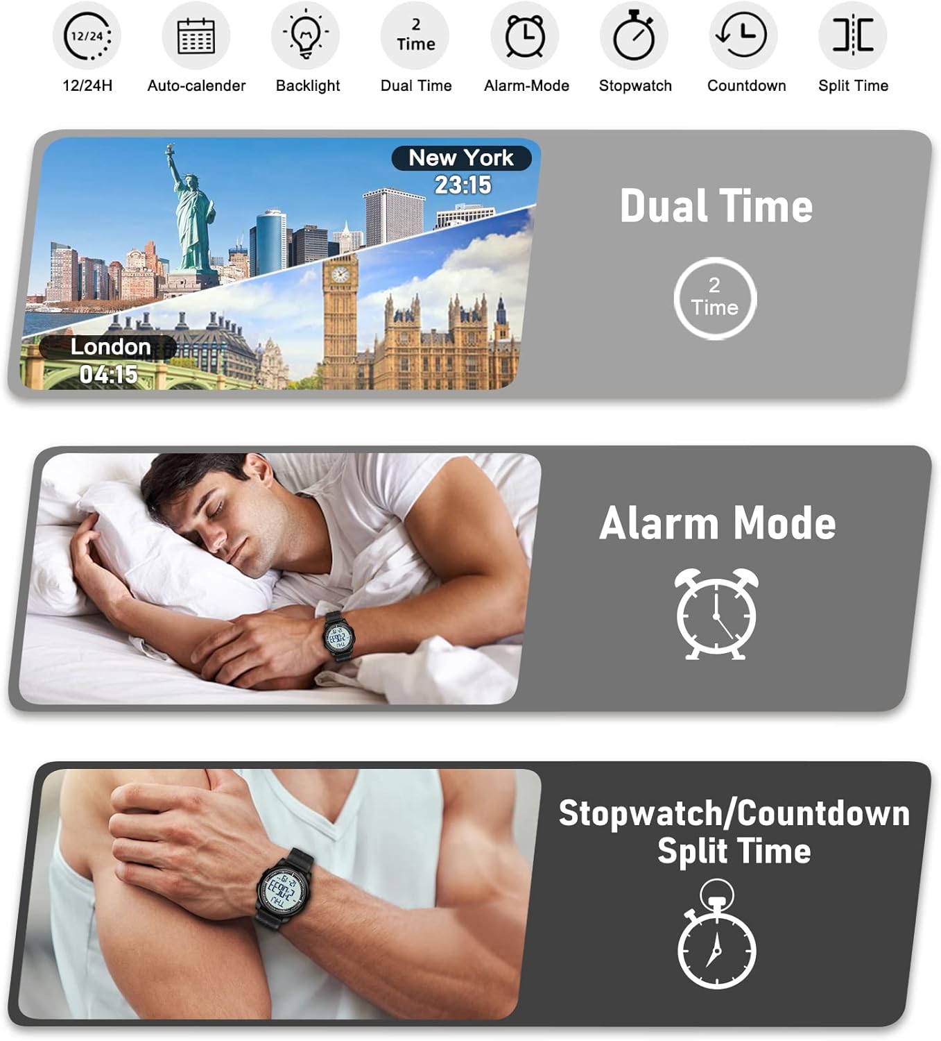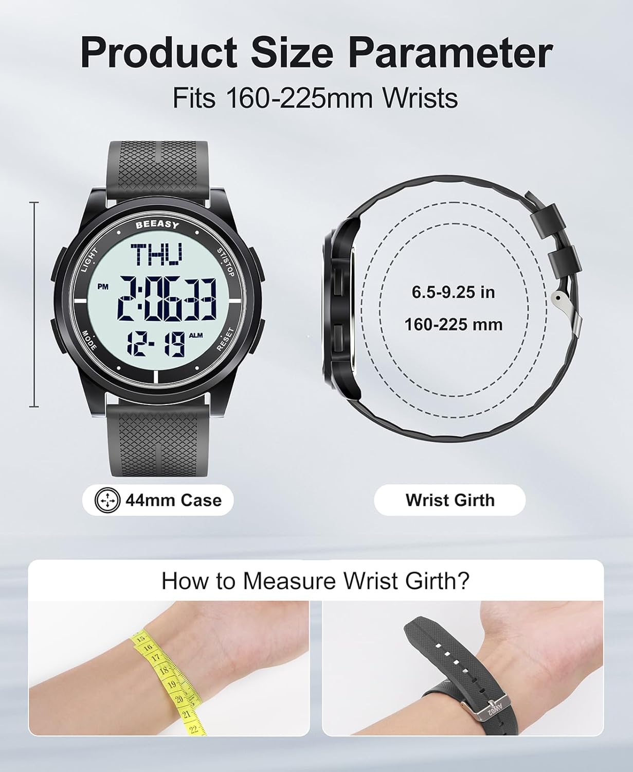 Beeasy Digital Watch Waterproof with Stopwatch Alarm Countdown Dual Time, Ultra-Thin Super Wide-Angle Display Digital Wrist Watches for Men Women