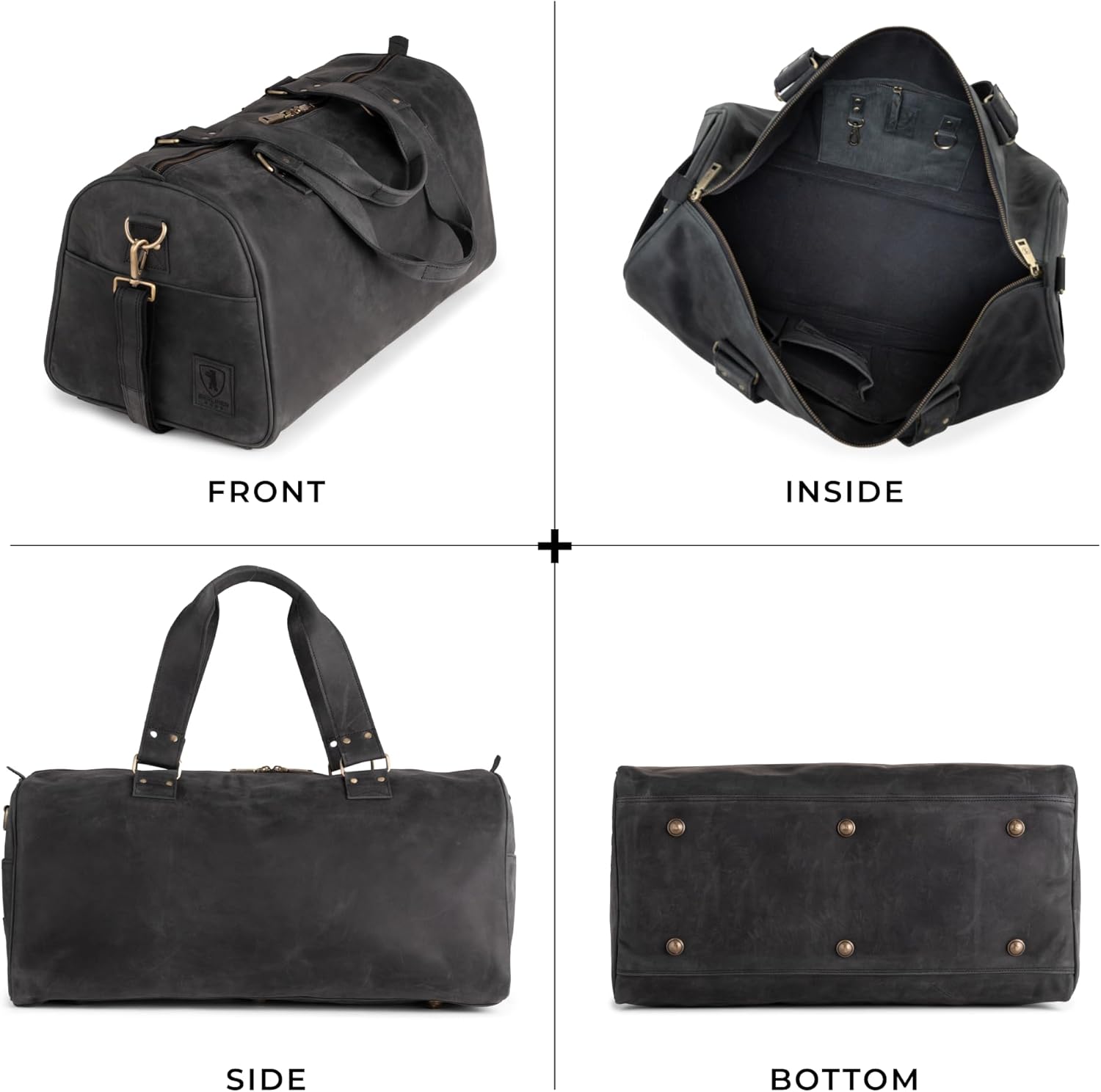 Customers find this duffel bag to be of beautiful quality, with well-sewn seams and smooth leather that holds up well over time. They appreciate its spacious design with multiple pockets and a large shoe compartment, making it perfect for weekend travel and overnight stays. The bag’s size accommodates several days’ worth of clothing, and one customer notes its distressed leather look that’s easy to love.