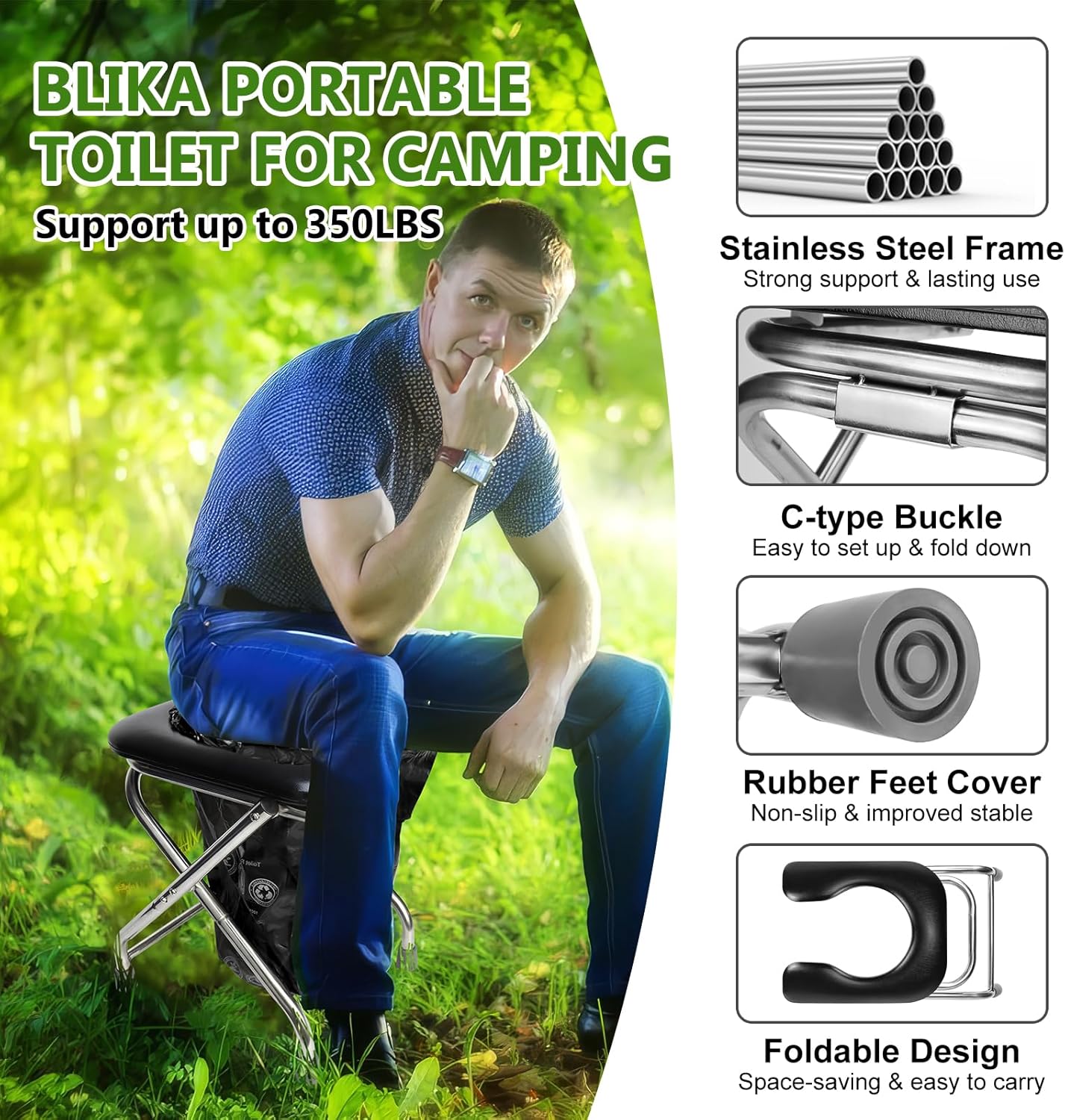 BLIKA Portable Toilet for Camping, 350LBS Stainless Steel Foldable Camp Travel Toilet with Soft Seat for Adults, Portable Potty for Camping, RV Travel, Road Trips, Includes Waste Bags with Gel