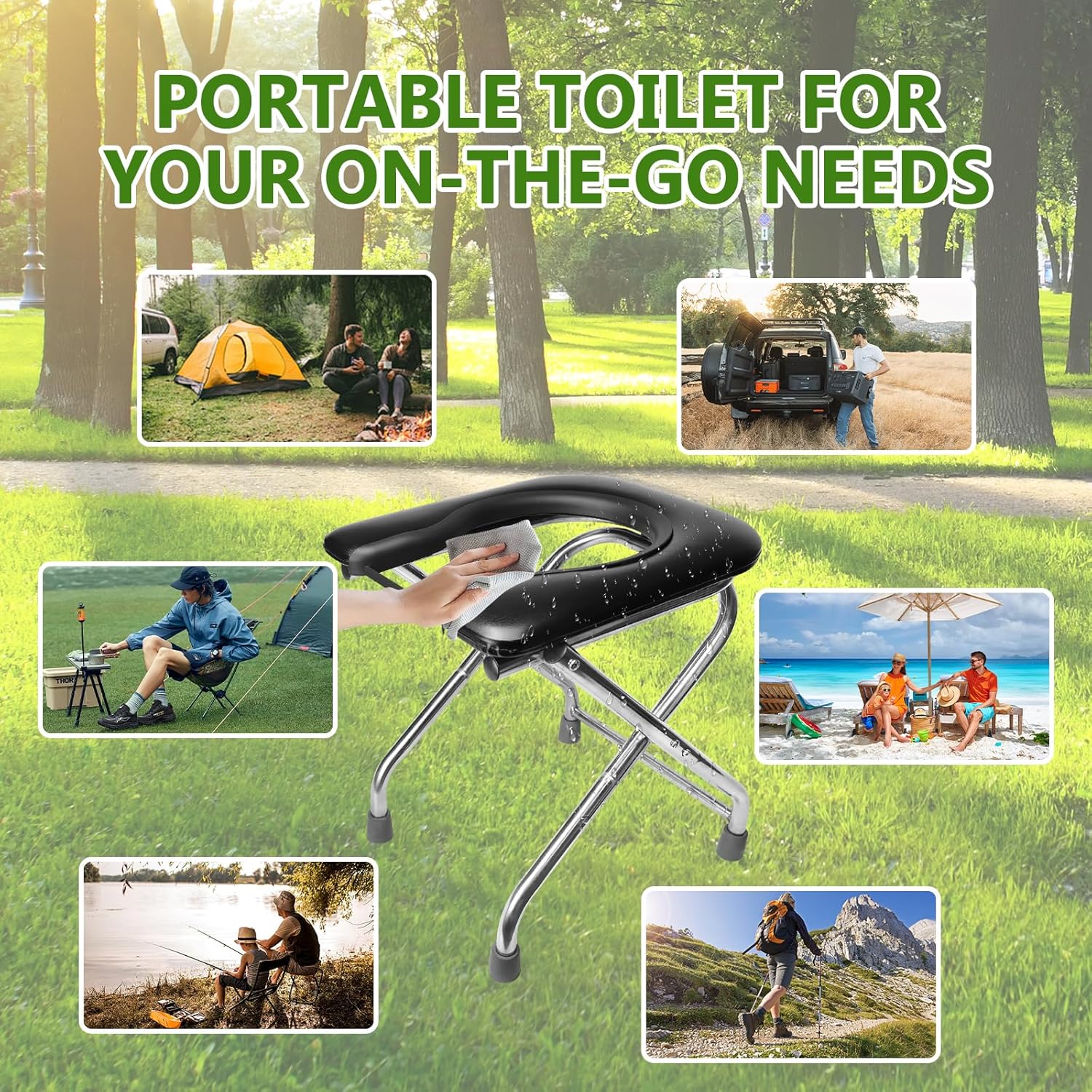 【Strong Support & Portable】Open Size: 15.5 x 12.2 x 16.5 inch, Closed Size: 24 x 5.9 inch. This lightweight portable toilet is made of stainless steel frame that is durable, waterproof, rust-resistant, and can support up to 350 pounds. Our 16.5″ folding camp toilet equipped with rubber feet which prevent slipping and better stability. The unique C-buckle design is easy to set up and fold down in seconds, it takes up minimal space in the storage, making it a perfect toilet for camping.