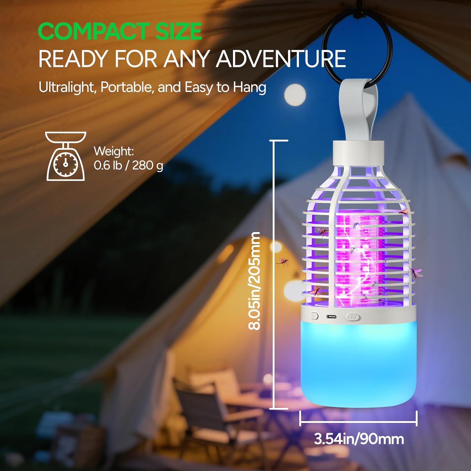 3-in-1 Multi-Function Design: Combines bug zapper, camping light, and RGB ambient lamp. Switch between vibrant color effects or practical white lighting as needed. Note: This unit is not waterproof. Avoid rain or submersion.
