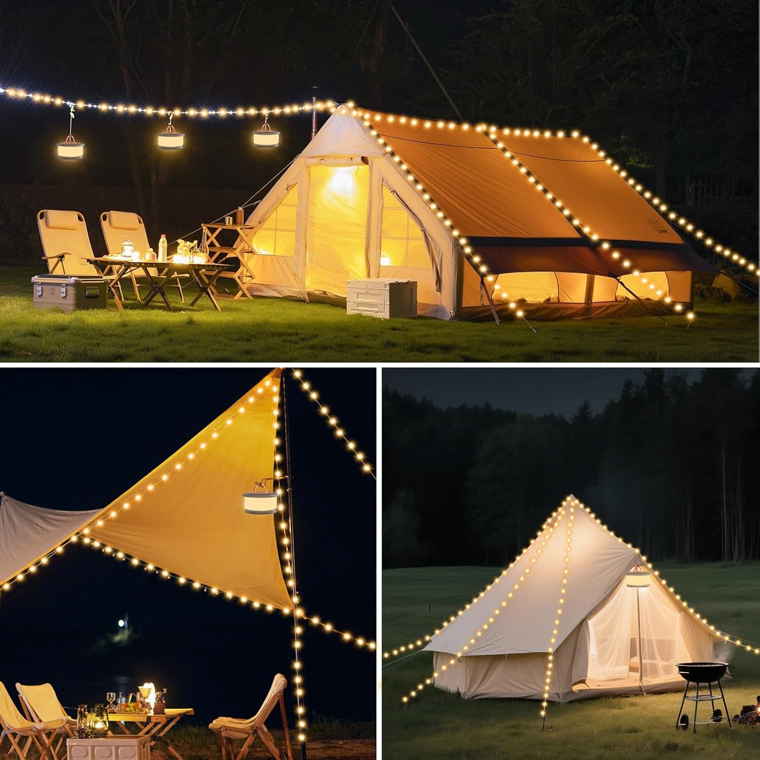 Camping String Lights, 3 in 1 Outdoor Camping Light with 6 Lighting Modes, Quick Storage 32.8FT Rechargeable Tent Lantern, Portable LED Hanging Light for Outdoor Patio Awning Garden Party