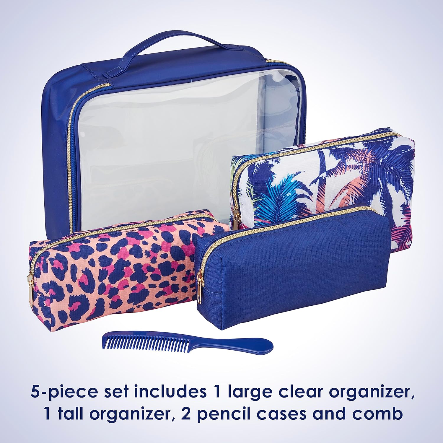 5-PIECE TOILETRY TRAVEL SET: Includes 2 polyester pencil cases (1 in a leopard print, 1 in solid navy blue), 1 large polyester organizer with tropical palm leaf print, 1 large turquoise comb, 1 large clear and navy blue bag.
