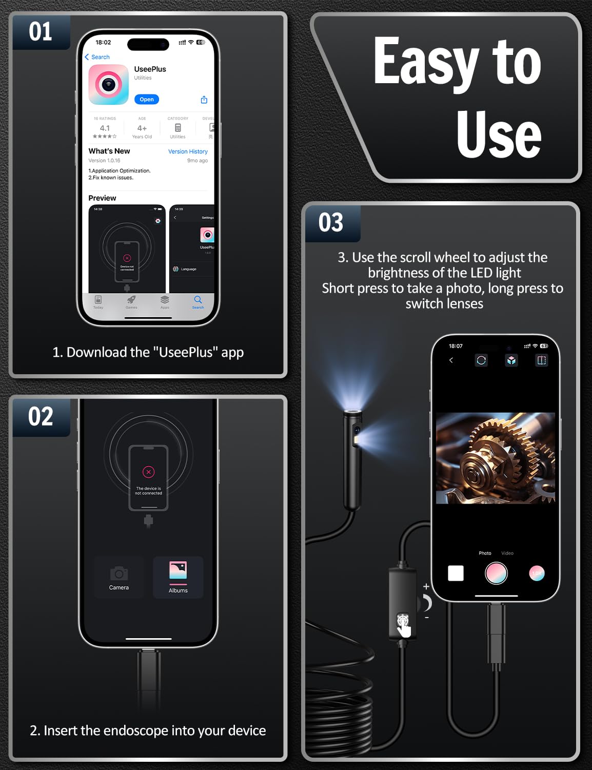 Wide Compatibility: The borescope inspection camera comes with Lightning, Type-C adapters for phones with Android 6+ and iOS 9+ and above. Whether you are an iPhone user or Android user, you can use it easily. Note: Only for Android smartphones/tablets with OTG and USB UVC function . Install the free app”UseePlus”, plug and play. Don’t fit computer.