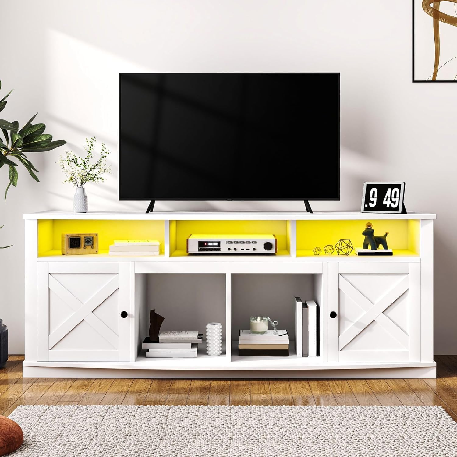 Be the first to review “DWVO TV Stand for 75/80 Inch TV, Entertainment Center, LED Light Media Console, TV Cabinet with Barn Doors and Power Outlet for Living Room, White”