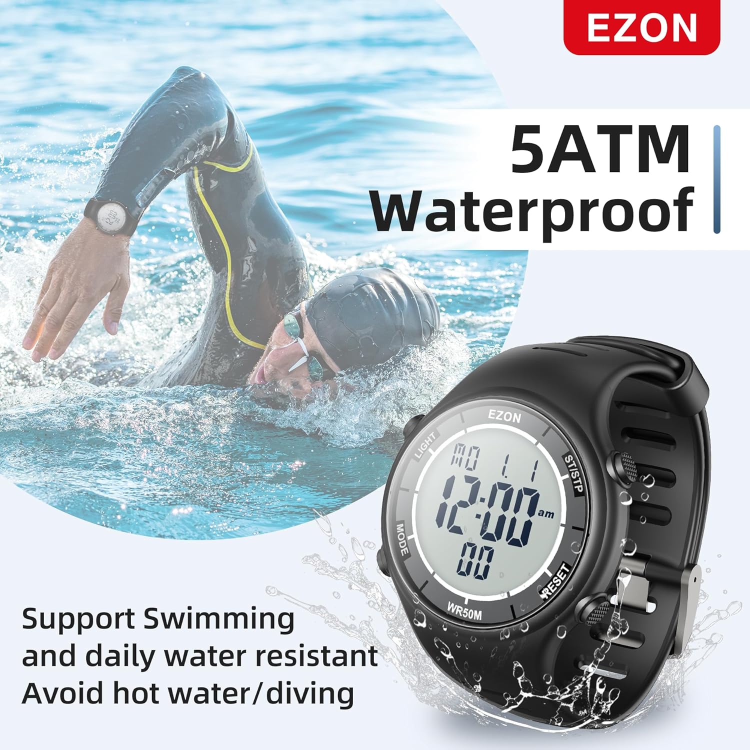 EZON Digital Watch with Stopwatch Countdown Timer Alarm EL Backlight,Ultra-Thin Large Display 5ATM Waterproof Digital Wrist Watches for Men Women