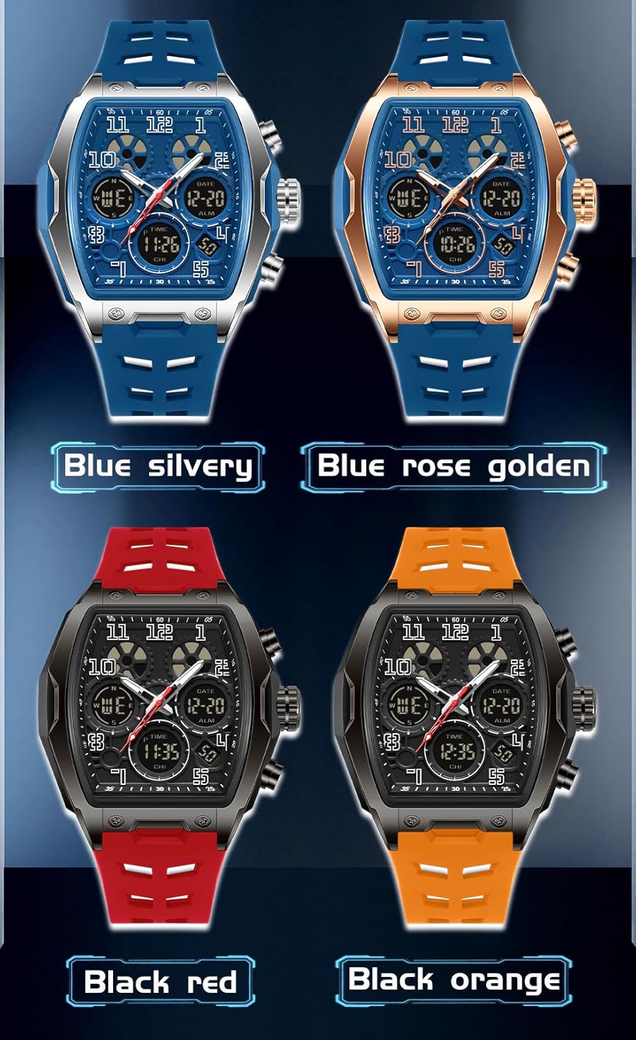 Men Unique Rectangle Dial Wristwatch with Digital Analog Dual Time Display