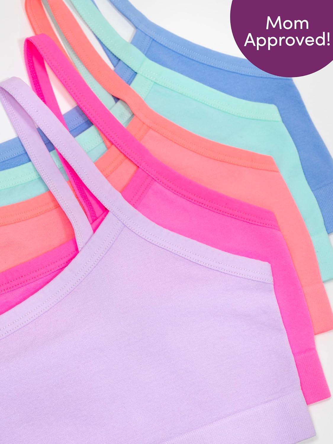 Soon to be your girl’s favorite first bra. Wherever she goes, these girls cotton bras will be there every step of the way. The Fruit of the Loom Girl’s Cotton Training Bras include four beginner bras in a variety of cute colors and prints, making it fun for her to get dressed in the morning. These training bras are made of soft, breathable cotton fabric for comfortable and lightweight support. The cami bras have an easy pullover style that won’t slow her down. These girls training bras have spaghetti straps and an elastic bottom band to keep her in place throughout the day.
