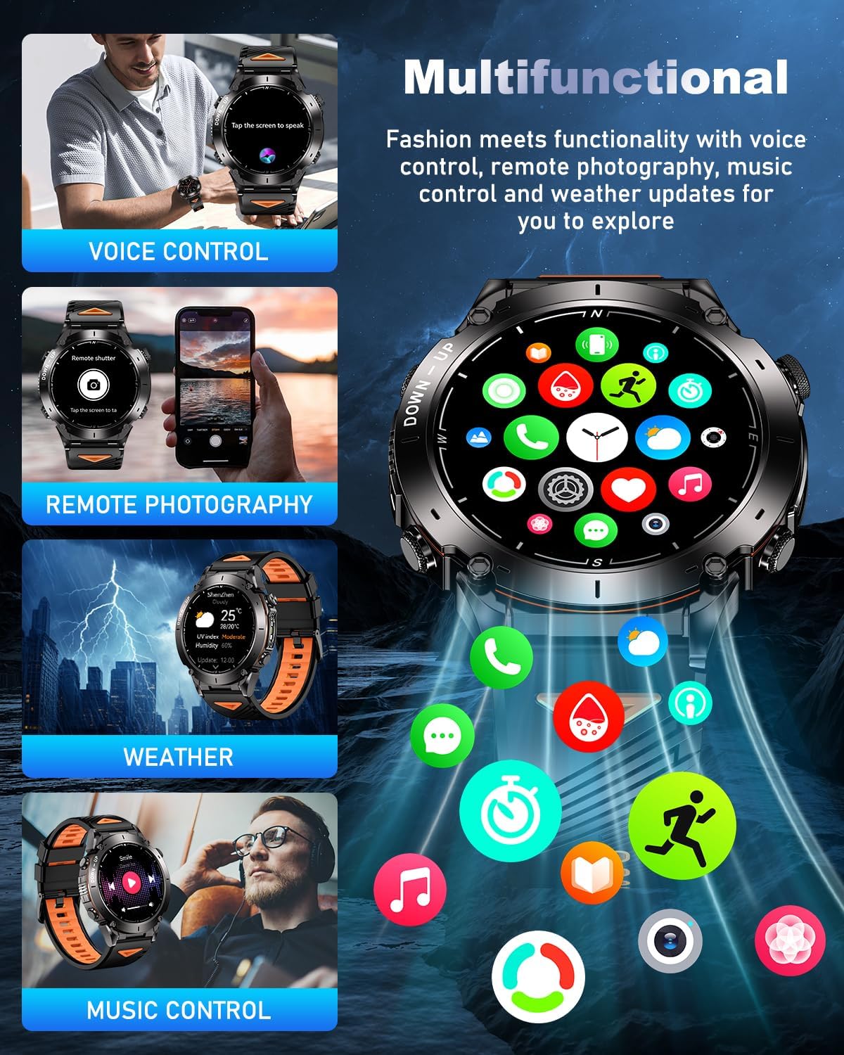 【Military-Grade Durability & 3ATM Waterproof】This Military-grade smartwatch built to withstand the toughest environments, Designed for extreme temperatures, dust resistance, and salt spray, it guarantees durability against shocks, water, and dust. With an 3ATM waterproof rating, it’s perfect for everyday use like handwashing, showering, or rainy hikes, making it a reliable companion for both outdoor adventures and rugged work conditions. (avoid using it for diving).