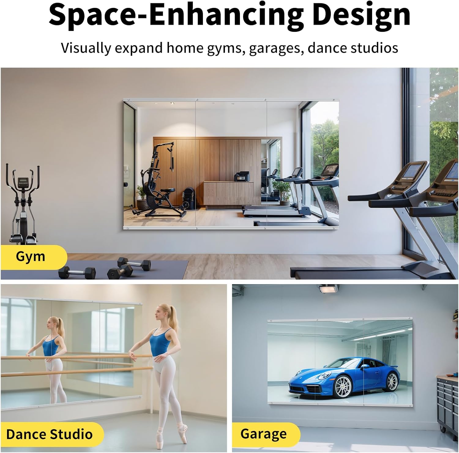 Versatile Multi-Space Design:InfiniGlass mirrors seamlessly adapt to any space from home gyms to dance studios, bedrooms to garages. The frameless modern look enhances decor while providing perfect reflections for fitness, yoga or daily routines, with flexible arrangement options for full-wall coverage or standalone use.