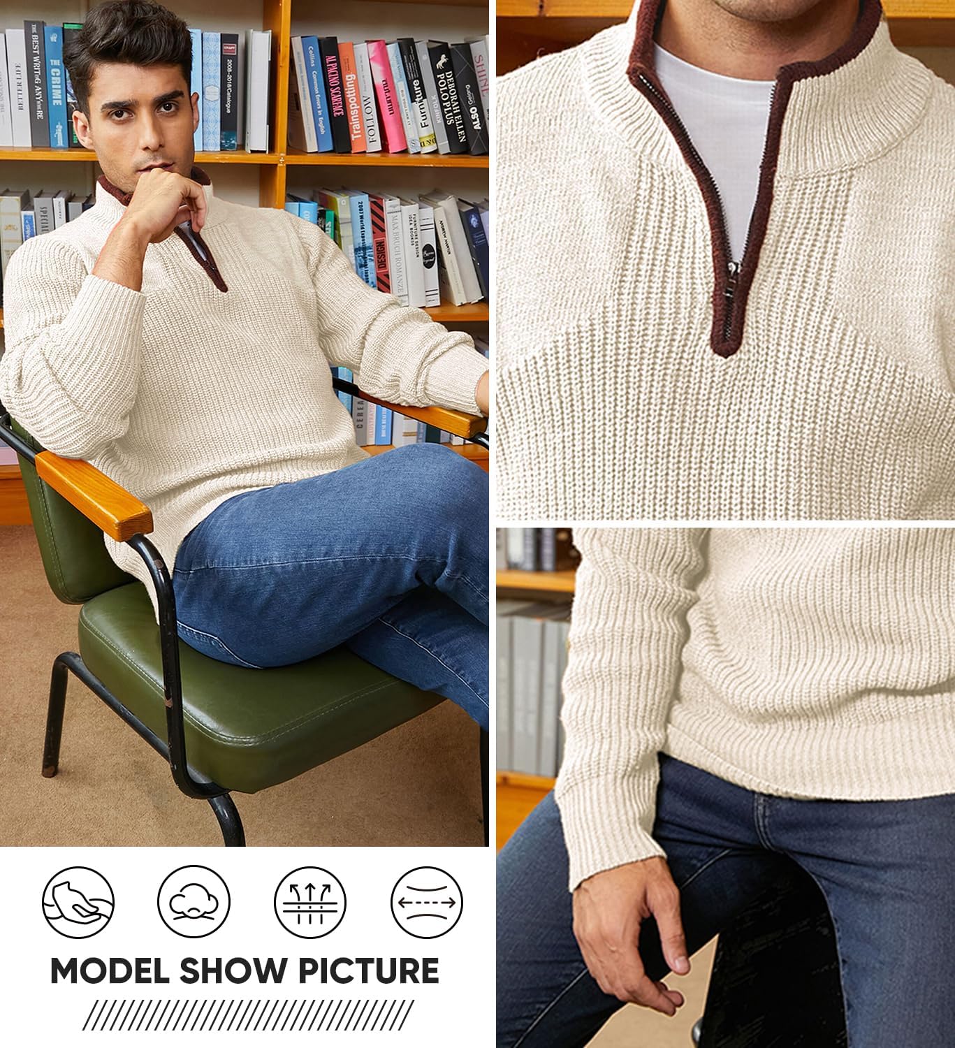 The video showcases the product in use.The video guides you through product setup.The video compares multiple products.The video shows the product being unpacked. JMIERR Mens Quarter Zip Sweater Merchant Video