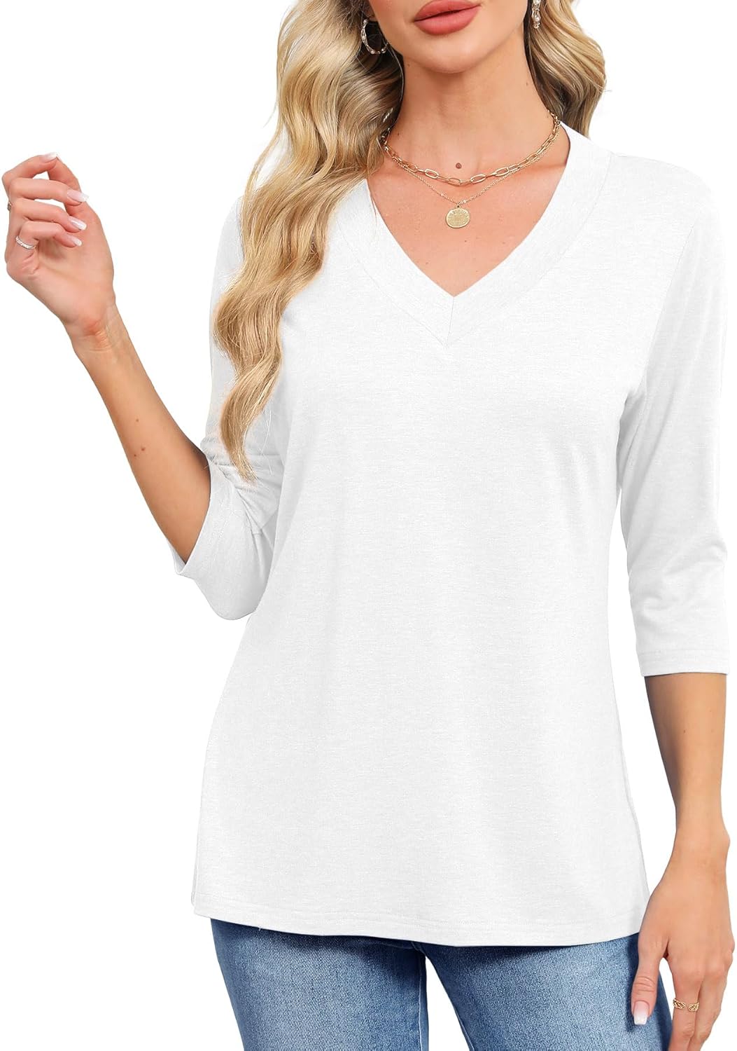 Ladies Blouses and Tops V Neck Shirts for Women 3/4 Sleeve Length Tunic Tops