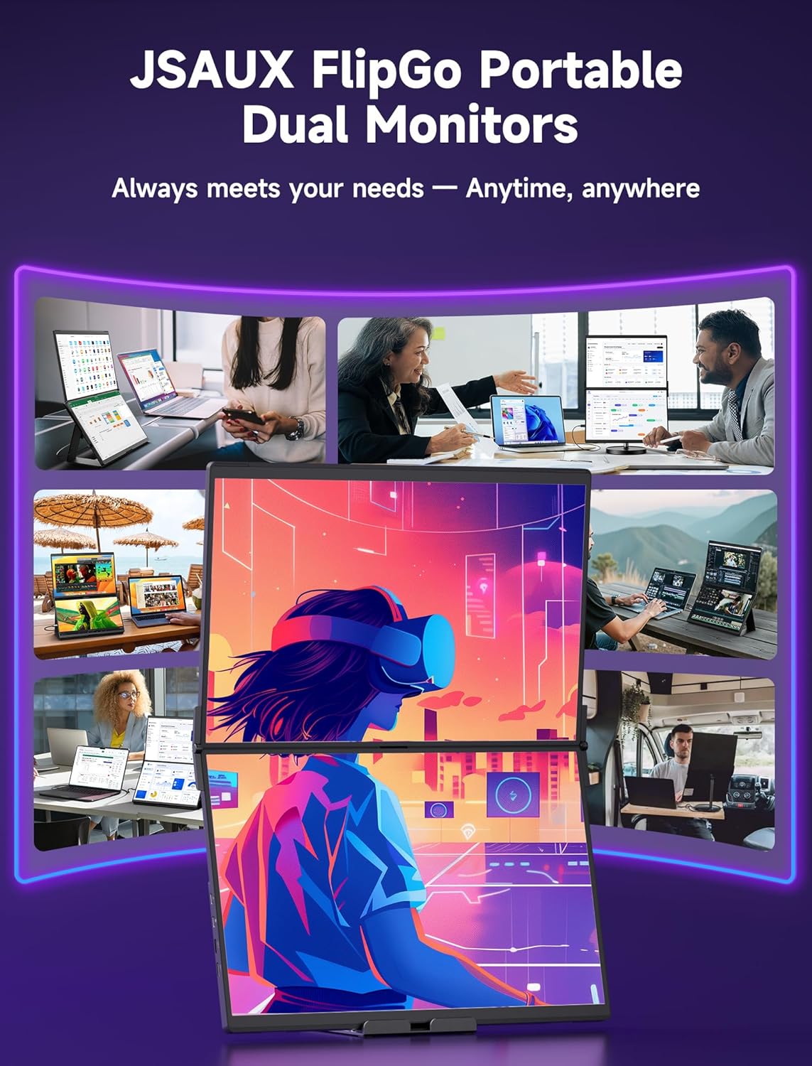 laptop screen extender portable dual monitor portable dual monitor Product showcase of black wireless earbuds and charging case against purple backgrounds with technical specification diagrams and feature highlights. JSAUX FlipGo portable monitor