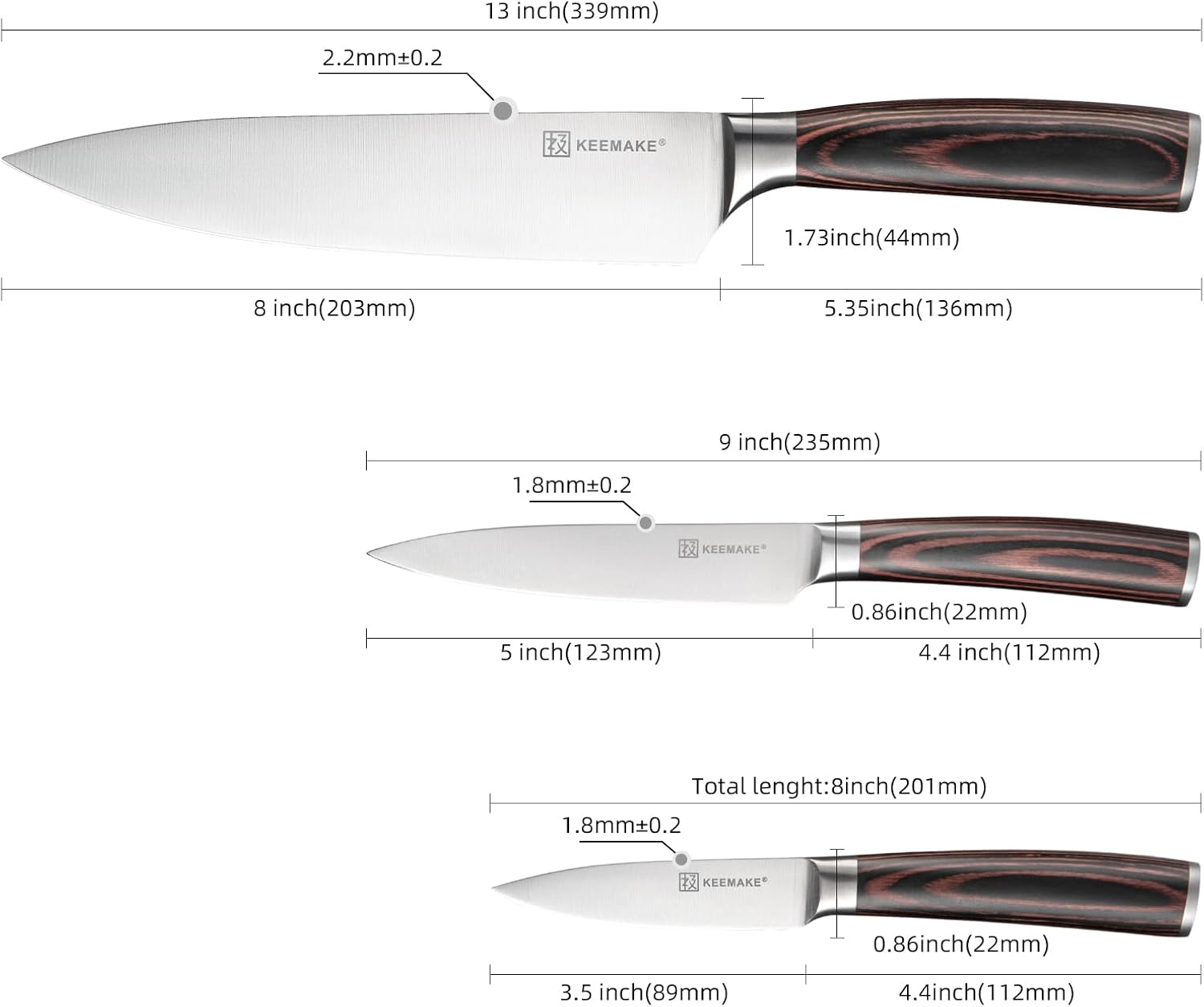 【Fit for Multi Tasks】Designed to handle a full range of kitchen tasks, this knife set includes 8″ chef’s knife, 5″ utility knife, 3.5″ utility knife. These durable sharp knives’ razor sharp blade runs effortlessly for chopping, slicing, dicing, mincing meat, fruits and vegetables