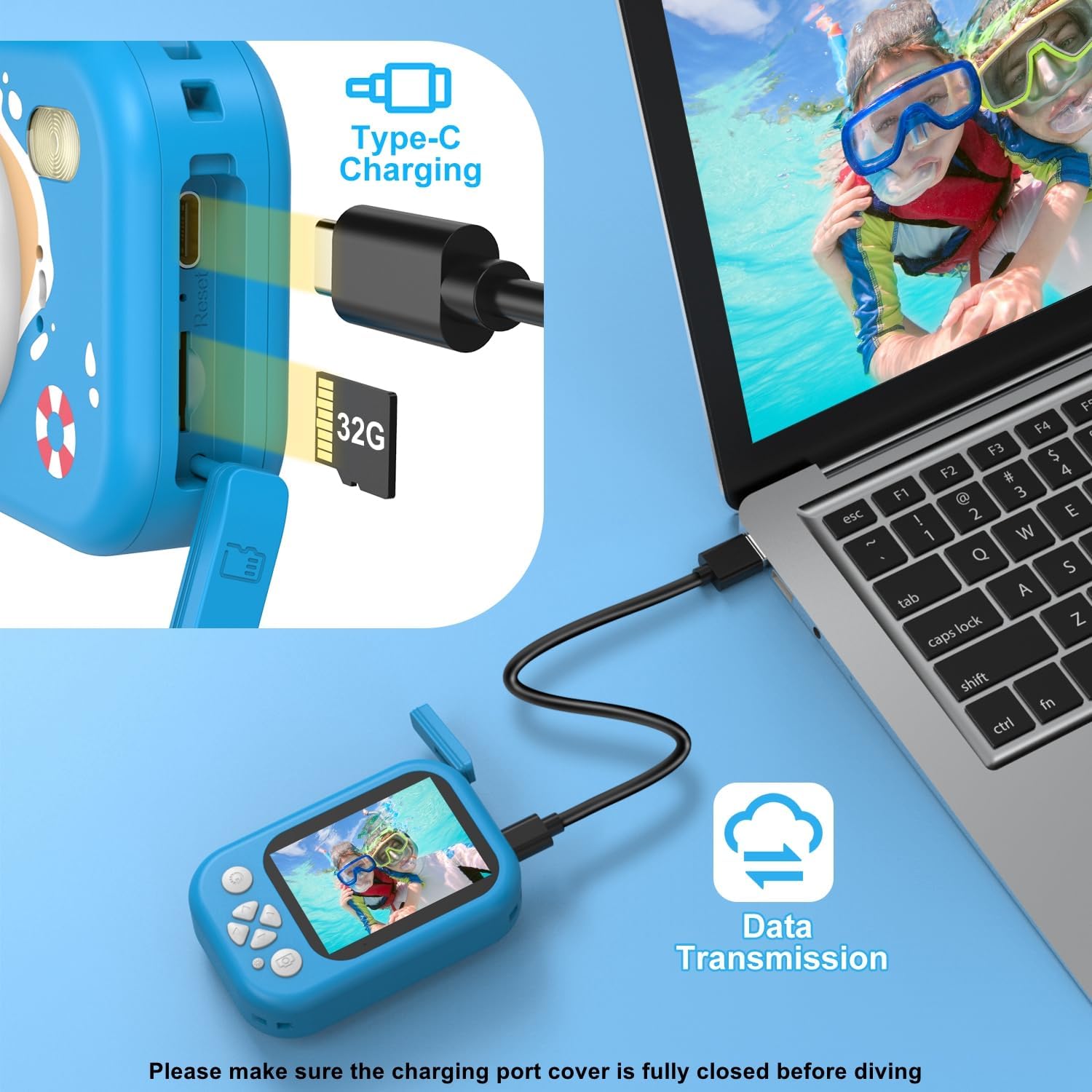 Kids Camera Waterproof, IP68 Underwater Camera for Kids Aged 3-12, HD Kids Digital Camera with 1080P Video Recording, Durable ABS Material, Pool Toys for Boys Girls with 32GB Card(Blue)