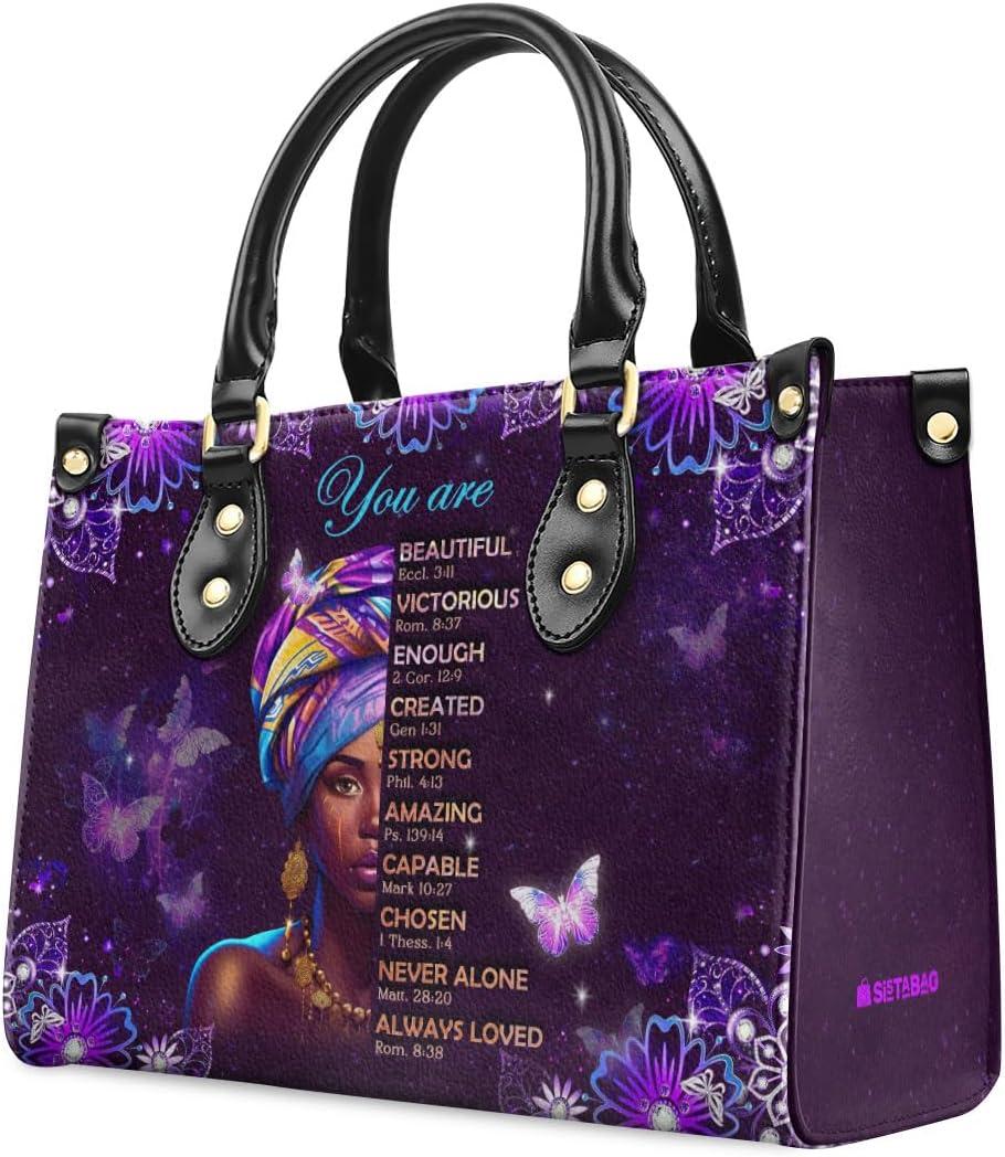 Customers find the handbag beautiful with vibrant colors, made of good material, and consider it a great gift that’s worth the price. They appreciate its spiritual message, with one customer noting the inspirational scriptures on it. The size receives mixed feedback, with some finding it nice while others say it’s too small. Several customers point out that it’s not made of real leather.