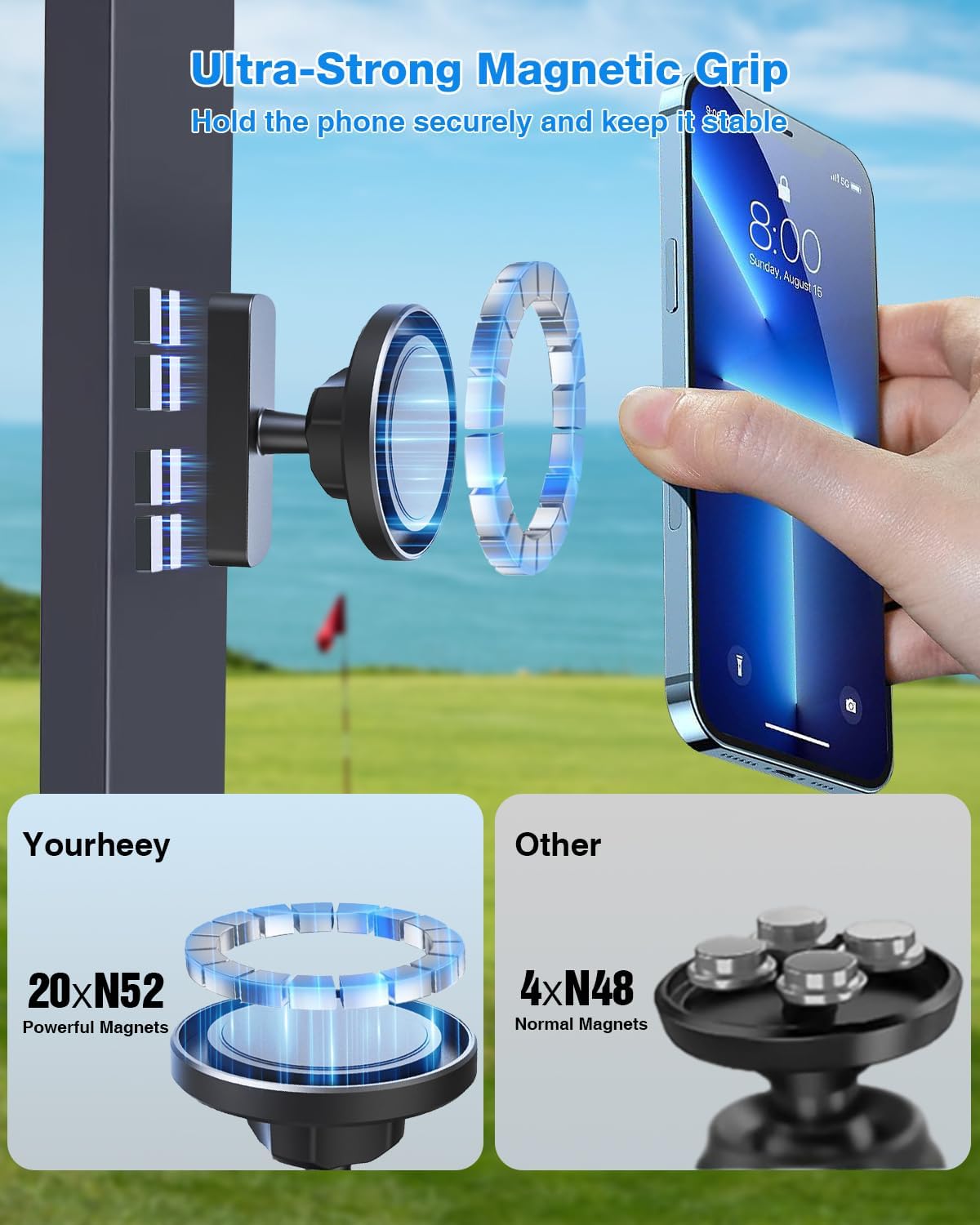 【Ultra-Strong Magnetic Grip】The golf cart phone mount features 20 powful N52 magnets on the phone-gripping side, precisely matching the MagSafe system of iPhone 16/15/14/13/12 series to ensure a firm hold. The upgraded rectangular base is equipped with 8 strong N52 magnets, providing stronger suction than traditional holders. It perfectly fits the support rod of golf carts and any metal surface.